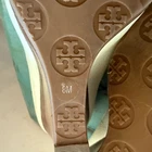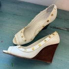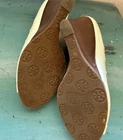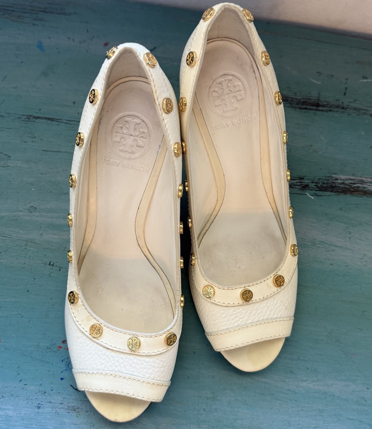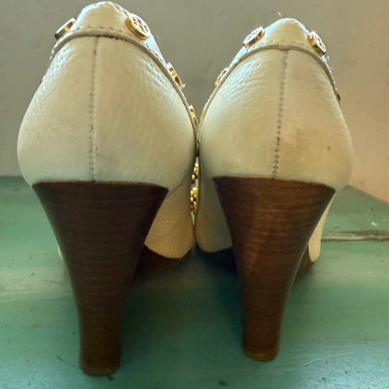The product is a stylish pair of Tory Burch white heels with gold accents, featuring a brown wedge design in size 8M for women. These elegant heels are crafted with a signature wedge style, perfect for adding a touch of sophistication to any outfit. The combination of the white color and gold accents gives these heels a chic and timeless look, making them a versatile choice for various occasions. Preowned Sold as found See photos for condition