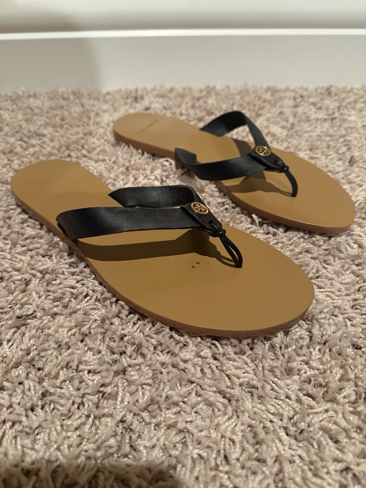 These shoes are new and unworn but do not include the original box. There is a mark on the insole of the right sandal but it of course cannot be seen when the sandal is worn. These NEW Tory Burch Women's Black Leather Flip Flops in size 7.5 are a stylish and versatile addition to any woman's wardrobe. Featuring a solid black color with the signature Tory Burch logo accent, these slip-on sandals are perfect for casual occasions during the summer, fall, and spring seasons. Made of high-quality leather, both the upper material and lining of the shoe offer comfort and durability. The flat heel design and leather insole provide added comfort, making them ideal for everyday wear. Perfect for adding a touch of luxury to any casual outfit, these Tory Burch flip flops are a must-have for fashion-forward women.