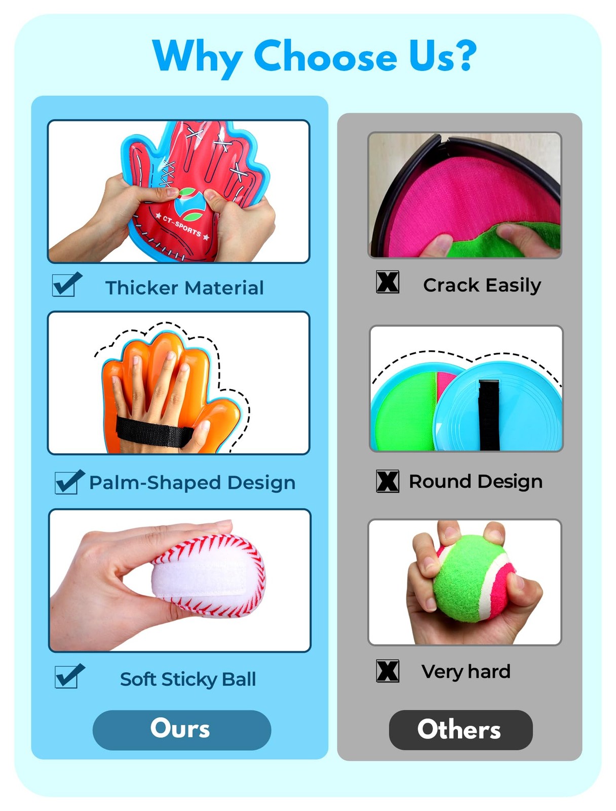This toss and catch game is a total hit with my kids! The paddles are super sturdy and waterproof, perfect for pool, beach, or backyard fun. The soft sticky balls are safe yet cling well, making it easy for little ones to catch. The baseball and football designs add extra excitement—my son loves pretending he's a pro player! Great for ages 3-12, and it holds up well even with rough play. Highly recommend for active kids who love outdoor games!