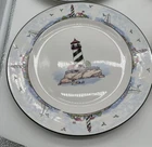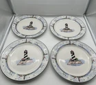 Add a touch of nautical charm to your dining table with this set of four Totally Today Coastal Lighthouse Dinner Plates. Each plate features a beautiful seascape pattern with a coastal lighthouse design, perfect for all occasions. The round plates are made of fine china material and are dishwasher and microwave safe. This four-piece set includes dinner plates that are factory made with a printed backstamp. The Coastal Lighthouse model is an original and licensed reproduction, showcasing a 21st-century era design. The plates are white with a multicolor pattern that will complement any decor. Whether you're hosting a dinner party or enjoying a family meal, these plates are a great addition to your collection. More of these available as well as more of this pattern