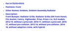 BRAND NEW - UNUSED - TOYOTA FACTORY PART TOYOTA HYBRID FRONT RADIATOR GRILLE EMBLEM WITHOUT PRE CRASH SENSOR AVALON HYBRID - CAMRY HYBRID - HIGHLANDER HYBRID PRIUS - PRIUS V Front Bumper; Radiator Grille; Radiator Grille (OR Front Panel). Fits Avalon, Camry, Highlander, Prius, Prius v Le, XLE models. 2012-15, without a precrash. 2010-11, without a precrash. 2015-17, without pre-collision. 2012-14, without pre-collision. 2014-16, without adaptive cruise, with hybrid. Please provide a VIN number at checkout so we can verify fitment prior to shipping. If no VIN# is provided, all shipping costs for returns and exchanges due to fitment issues will be the buyer’s responsibility. Return Criteria: - Items must be returned within 30 days. -The item must be new and never installed in any way, must be in its original packaging, be complete, be undamaged and have all its original and undamaged labels. -These criteria apply to all returns, even if you were sold the wrong part. -We kindly ask that you confirm you have the correct part before you destroy the packaging or attempt to install the part. -If you need assistance, please don't hesitate con to contact us. We are always happy to assist.