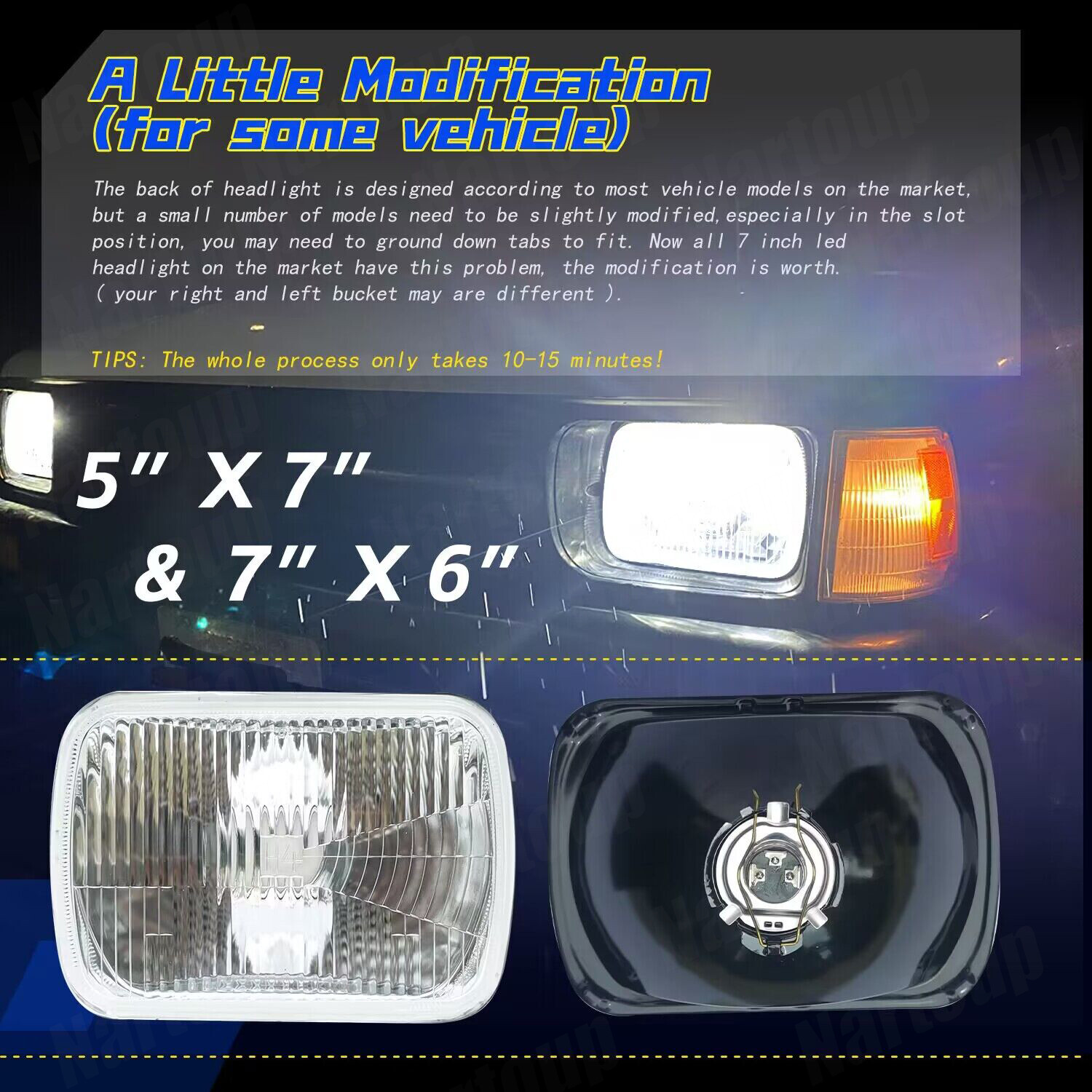 Nartoup - 7"x6" Stock Style H4 Headlights 200w/ LED Bulbs - Pair THESE ARE H4 CONVERSION HEADLIGHTS WITH A STOCK STYLE GLASS LENS AND METAL HOUSING! INCLUDES (2) HIGH INTENSITY LED H4 XENON WHITE LIGHT BULBS! 5X7 7X6 INCH SQUARE HEADLIGHT - PAIR CRYSTAL CLEAR GLASS LENS / METAL BACKSIDE FITS STOCK BUCKETS WITHOUT MODIFICATION PLUGS INTO FACTORY WIRING PLUGS LOW BEAM AND HIGH BEAM BULBS ARE REMOVABLE AND REPLACEABLE 100W LED BULBS INCLUDED PLUG AND PLAY DOT / SAE APPROVED This listing is for a new pair (2 bulbs right & left) 7x6" 5X7"diamond crystal clear semi-sealed beam glass lens / metal housing headlights. These headlights have a clean custom look but fit into the stock buckets and plug into the stock wiring without modification. ( Or some models need to be modified) These light up in a similar color as the original headlights. These have the original 3 prong plug design on the back so they will plug directly into the original wiring harness. These will fit any car or truck that has 2 rectangle glass headlights that are 7x6 inches. These are glass faced headlights with a metal backside. We will take extra care in packaging. Specifications: * Brand:Nartoup * Condition: 100% Brand New * Light Source:2 Sides COB LED * Material: Aviation Aluminum + ABS * Color Temperature: 6000K-6500K * Working Voltage: DC 9-32V ( Fit 12V,24V Vehicle ) * Output Power (Each): 100W * Number of Bulbs: 2 * Waterproof Rate: IP68 * Luminous Flux: 10000lm/Bulb * Working Temperature: -40℃ - +80℃ * Bulb Type: H4 * Beam Type: High Beam/ Low Beam * Beam Angle: 360 Degrees * Lifespan: Over 50,000 hours * Heat Dissipation Principle: Heat Pipe Technology + Aluminum Radiator * Fitment Type: Direct Replacement * Placement on Vehicle: Front, Left, Right * Color: As the picture shows Package include: 2pcs 7Inch Led headlights Housing 2pcs H4 LED Bulbs 2PCS H4 9003 to H13 9008 Connectors Cable Adapters Harness Note:No mounting bracket. New boxes and old boxes are sent randomly!!! After service Notification: If you are satisfied with our product and service please leave us a positive feedback,if there is any problem when you received the package,please feel free to contact us,we will be definitely give you a satisfying solution,when you choose the return reason .please choose the reason"i don't like it". By this option we will accept your return immediately and provide return label for full refund. the others reason to return will take both of us many troubles to handle. If you have any questions, please feel free to contact us, we are happy to answer them for you. Hope you will have a good shopping experience~