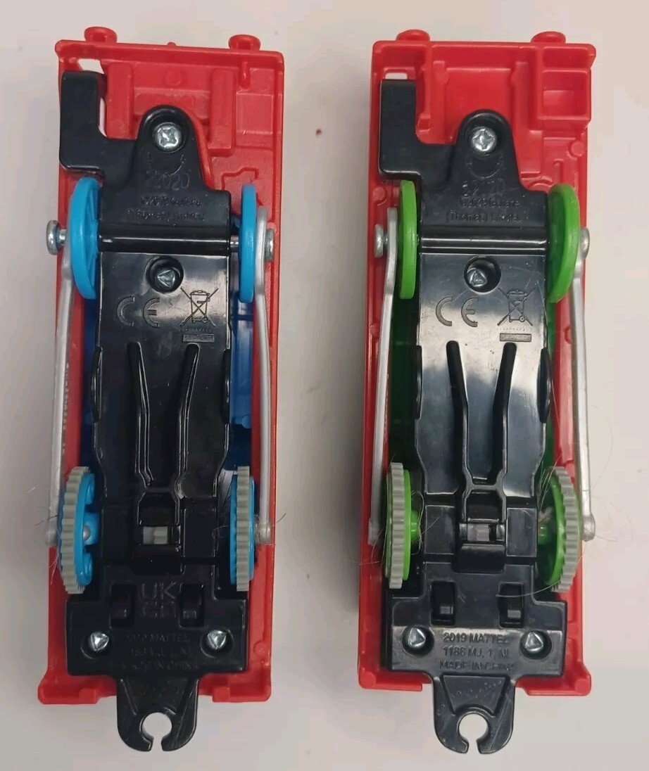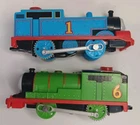 The "Thomas and Friends Light & Sound Trackmaster Percy & Thomas" set includes two Trains Percy the Small Engine and Thomas the Tank Engine from the TV show "Thomas & Friends." These talking trains feature light and sound working good need batteries and sound effects, making playtime more engaging for children ages 2 and up. The set is a licensed reproduction from the "Thomas & Friends" franchise by Mattel, suitable for both boys and girls who enjoy playing with train-themed toys. Made of plastic, these Trains are part of the Thomas & Friends TrackMaster collection, perfect for fans of the popular cartoon series.