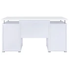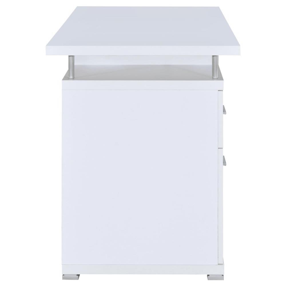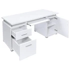 Infuse your home office with style and convenience. This contemporary computer desk features an elegant white finish and metal detailing finished in silver for a sleek, chic appearance. Its ample storage options include a cabinet with an adjustable shelf, a large file cabinet, and a smaller upper drawer. A slide-out keyboard tray completes its versatile appeal. Constructed from steel, MDF, particle board, and engineered veneer, this desk is durable enough for day after day of productivity. Features: Includes: One (1) computer desk Office desk with modern design and clean white finish for a bright workspace Two drawers include one utility drawer and one file drawer for organized storage Cabinet with adjustable shelf provides enclosed space for supplies or equipment Slide-out keyboard tray adds functionality without reducing work surface space Silver-finished hardware and riser accents offer sleek metallic detailing Built from engineered wood, melamine laminate, and honeycomb board for durability Specifications: Product Dimensions: 29.5" H x 55" W x 23.5" D Product Weight: 105.6lbs Number of Shelves: 1 Number of Doors: 1 Number of Drawers: 2 Drawer Weight Capacity: 22 lbs Shelf Weight Capacity: 22 lbs Assembly Required: Yes Warranty: One (1) year limited manufacturer warranty