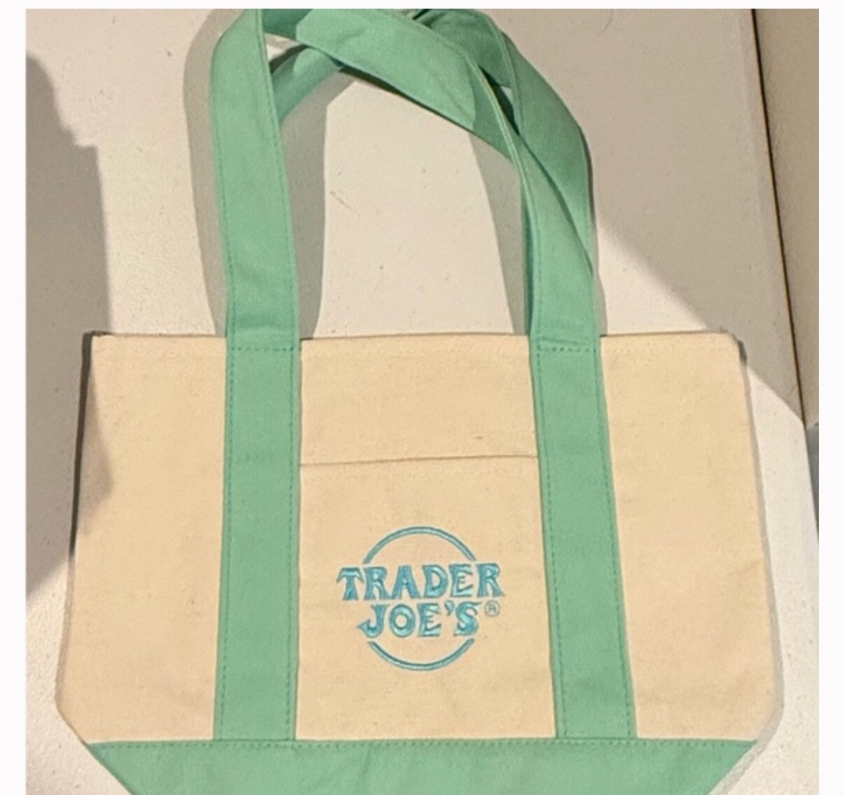 This adorable mini tote is a must-have for spring! The pastel mint green and turquoise combo is so fresh and cheerful—perfect for adding a pop of color to any outfit. Lightweight yet sturdy, it fits all my essentials without feeling bulky. The canvas material feels durable, and the green handles add a cute contrast. Super practical for quick errands or a day out. Love the Trader Joe’s charm—such a fun and functional little bag!