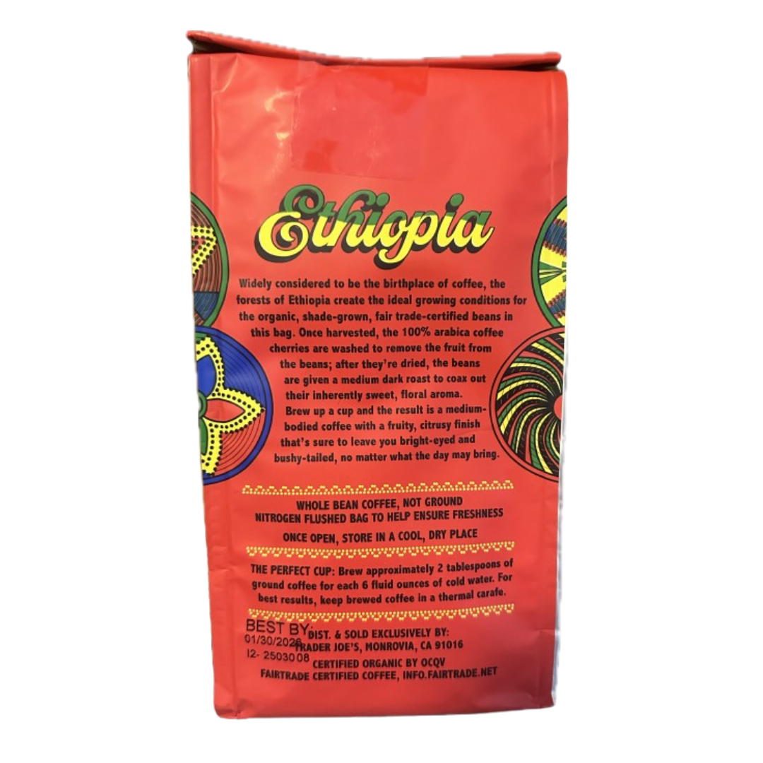 Trader Joes Organic Fair Trade Shade Grown Whole Bean Coffee Ethiopian Medium Dark Roast 13 o z bag