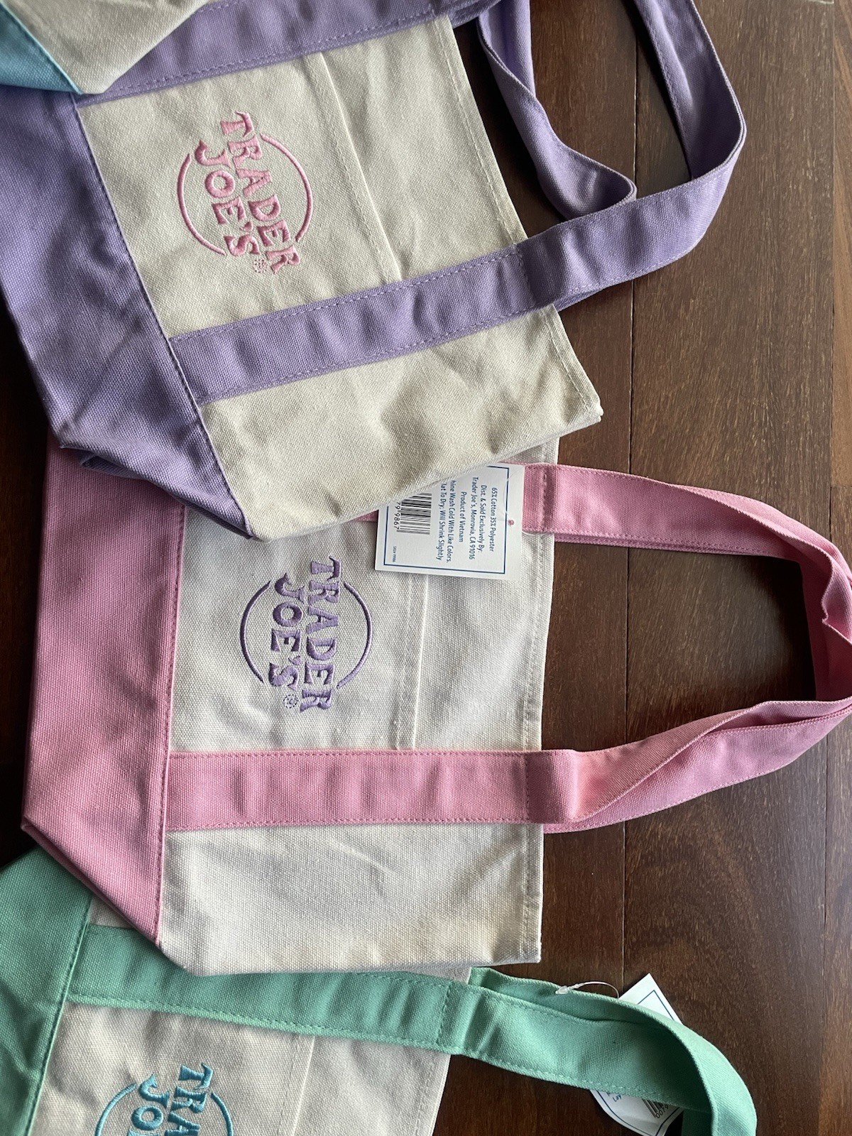 Absolutely love these adorable mini totes! The pastel colors are so cute and vibrant—perfect for adding a pop of fun to any outfit. Lightweight yet sturdy, they’re ideal for quick errands or as a stylish everyday bag. The double handles make carrying a breeze, and the canvas material feels durable. Such a rare find—definitely a must-have for any Trader Joe’s fan!