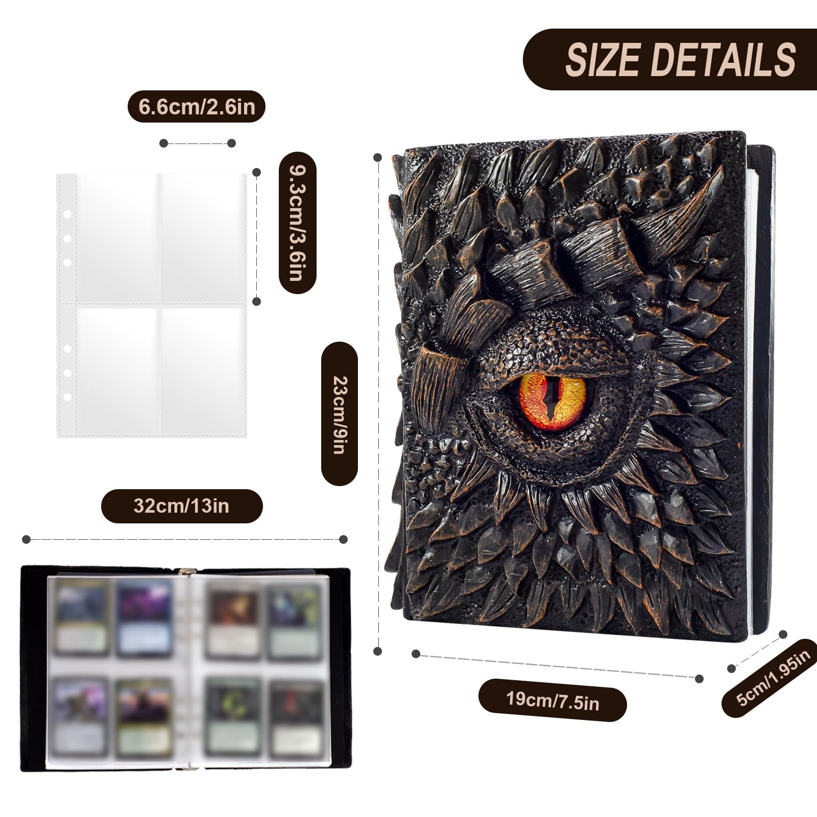 Exquisite Collection:With dimensions of 1.95 x 7.5 x 9 inches, this card binder is an excellent choice for collectors. It fits perfectly on bookshelves, cabinets, or desktops, making it a versatile addition to any space. Unique Design : Handmade 3D cover made from durable high-quality ring resin material, offering a comfortable touch with a fantastical dragon relief. with each card binder being uniquely distinctive. Large Capacity:4-Pocket binder with 50 pages of sheets can hold up to 400 cards, providing plenty of space to get all your cards organized. Standard Size:Card Binder is compatible with standard sized cards such as Fuji mini Polaroid photos, YGO Card Game, Football Cards, Baseball Cards, MTG Card Game,etc. Exquisite Collection:With dimensions of 1.95 x 7.5 x 9 inches, this card binder is an excellent choice for collectors. It fits perfectly on bookshelves, cabinets, or desktops, making it a versatile addition to any space. Practical Gift: This card binder is not just functional but also a work of art. Its exquisite craftsmanship is sure to impress.makes a thoughtful gift for birthdays, holidays, anniversaries, and other celebrations.
