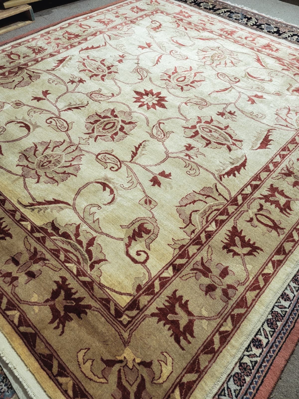 This Traditional Oushak-Style Wool Rug is a handmade area rug measuring 8 x 9 feet, featuring a subtle floral design in warm tones. The rug is made of 100% wool and is hand-knotted in a rectangular shape, showcasing the intricate craftsmanship and original design characteristic of Oushak regional design. Suitable for any room in the home, this traditional-style rug adds a touch of elegance and comfort to any space with its beige color and floral pattern.