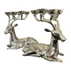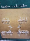 New never used.Traditions Beautiful Centerpiece or Mantle Decoration. Reindeer Candle Holders. Brass Construction with a silver-plated finish. Each holds 6 spherical (ball-shaped) candles. Candles are not included. This item is new and in perfect condition. These are flawless and they have felt like material on the bottom to prevent any scratches. Original box has some shelf corner wear. SIZE: 9" long x 9 1/2" tall. Buyer to pay actual shipping charges.