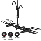 The Trail Rider bike rack system by fits most bikes using a padded universal frame clamp and adjustable wheel holders. Lightweight and ruggedly built, this durable bike rack can carry up to two bikes and offers quick and easy loading. Simply drop the bike into the wheel holders, then slide the locking ratchet frame hook down onto the frame to secure the bike. Includes velcro wheel straps to keep the wheels from spinning while driving. Fits hitch sizes 1.25” and 2”. Not to be used on any trailer, fifth wheel or towed vehicle. Simple, Strong, Secure: Keep your bike safe during transport with the Trail Rider Hitch Mount Bike Rack! This hitch bike rack for 2 bikes is the perfect bicycle rack for a car, and our bike racks are made for convenience and strength. High-Quality and Durable: Crafted with sturdy alloy steel, this bike rack for an SUV or car will keep your bikes safe and secure no matter your destination. Our bike hitch rack has locking bike frame hooks to deter theft with a keyed alike hitch pin. Transport Your Bike: These bicycle car racks are designed to keep up to 2 bikes secure during transport. Our bike mount for a car has a max capacity of 45 lbs per bike and does not support E-Bikes. Kids bikes, ladies' frame bikes, and some mountain bikes may require a top tube adaptor. Always Convenient: With locking hooks to hold frames and protective padding, our bicycle rack hitch carrier works with 1 ¼” and 2” hitches and folds down to access the trunk. Just drop the bike into the adjustable wheel holders and head off! Designed for Simple Storage: With foldable wheel support tubes and folding bike support arms for easy storage in the garage or other part of your home, this bike rack hitch weighs only 34 pounds, so it is convenient whether or not you're traveling!