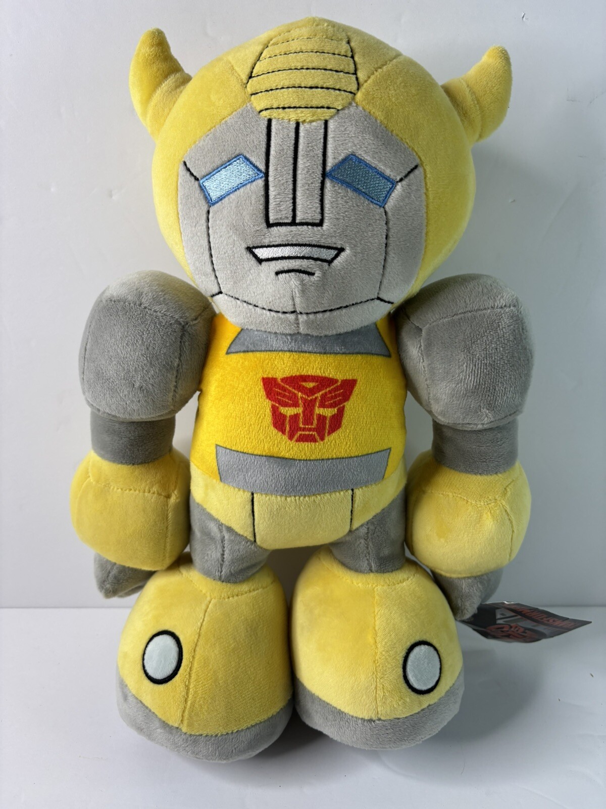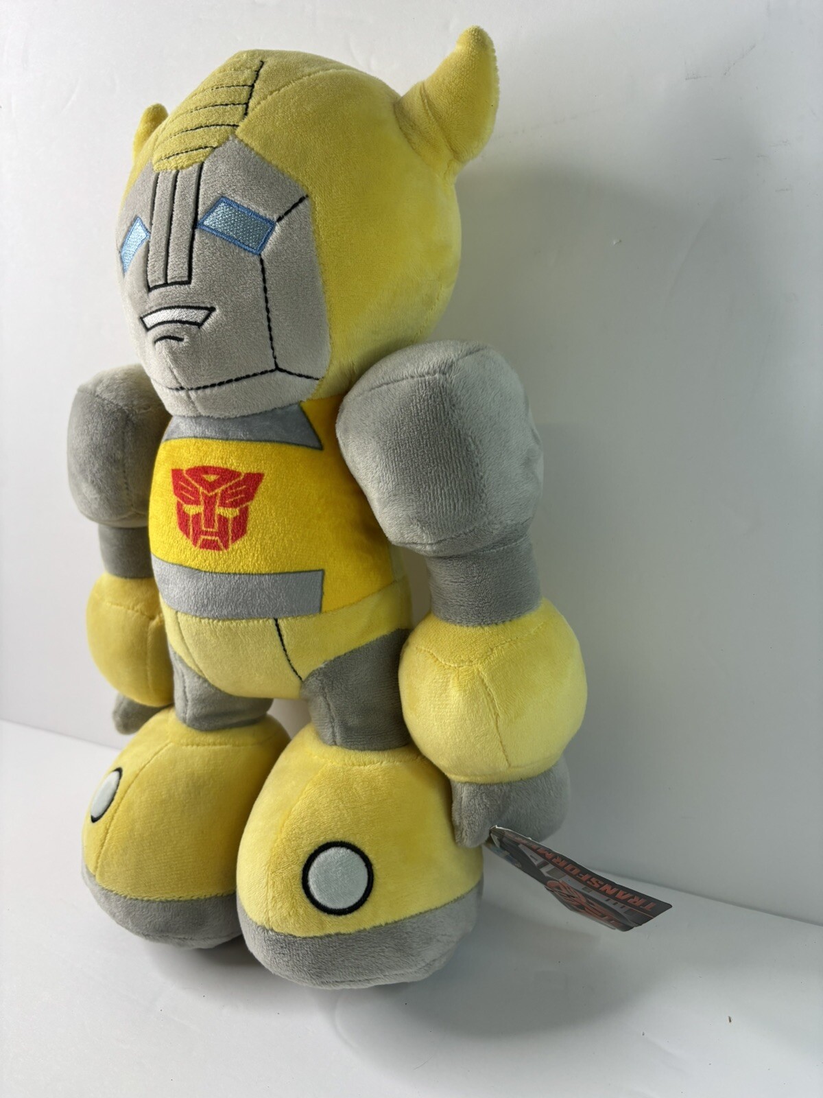 This is a 17" plush stuffed toy of Bumblebee from Transformers, produced by Hasbro. It features a colorful design and is recommended for ages 3 and up. This toy is a souvenir from Universal Studios, making it a special collectible item for fans of the Transformers franchise.