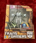 The item is a Transformers Hunt For The Decepticons Highbrow Voyager Class action figure manufactured by Hasbro in 2010. It is a green plastic figure of the character Highbrow, a green airplane, from the Transformers franchise. The action figure includes a gun and features transforming abilities, staying true to its Autobot faction. This collectible piece is part of the Voyager series and is designed for children aged 8-11 years who enjoy the Transformers TV show and movie.