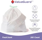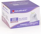 CONVENIENCE: All ValueGuard Drawstring trash bags are packed in the dispenser box. It is easy to use and store them.Just pull out one bag each time, with no bother of tearing one from another, flextra drawstring closure for easy tying and carrying. LARGE CAPACITY: Each trash bag is 25" wide and 28" Tall, which can fit for most trash can, large capacity of 13 gallons make sure you only need to throw garbage once a day, with 0.6mil(15μm) garbage bag's thickness can prevent leaks and is strong enough to handle the heavier loads GREAT VALUE: 13 gallon kitchen garbage bags retain extremly good toughness and the edges are tightly connected with fine seams, high load-bearing and not easy to tear and leak proof. Ideal for handling wet and heavy food waste. FUNCTION: Large trash bags hold both wet and heavy kitchen waste & large volume of redundant materials, and also be used to store large clothes, blankets, toys and more household items. Great for kitchen, living room, storage, office, camping. EXCELLENT CUSTOMER SERVICE: At ValueGuard, if you have any question, just contact us. The specific steps: Log in to your Amazon account, and enter the "My Orders" page. Find the order where you need to contact us and click the "Contact Seller". Product Description Are you looking for a way to keep your home tidy and fresh? Don't look for it anymore, ValueGuard trash bag is a good solution! Value Guard focuses on producing a variety of garbage bags, choose from trash bags of different capacities, with different closures, pack sizes,colors and finishes, all ready to make your everyday effortless. ValueGuard large trash bags are made of polyethylene with odorless, durable and strong enough to hold many kinds of garbage. This kind of material can make the large garbage bags more stronger. ValueGuard trash bags provide your home or office a quality life, make your life more convenient. Large trash bags hold both wet and heavy kitchen waste & large volume of redundant materials, and also be used to store large clothes, blankets, bed sheets, quilt, toys and more household items. Great for kitchen, living room, storage, office, camping. You will love the convenience and reliability brought by these 13 gallons trash bags. Flextra Drawstring Double layer toughness flextra drawstring not only can effectively prevent the leakage of garbage odor, but also easy to tying and carrying. Strength & Toughness Just pull out one bag each time, with no bother of tearing one from another; Strong toughness and resists punctures; The edges are tightly connected with fine seams which resists leaks. ValueGuard Garbage Bag Flextra drawstring closure for easy tying and carrying, strong toughness and the edges are tightly connected with fine seams, strong load-bearing and not easy to tear and leak proof.