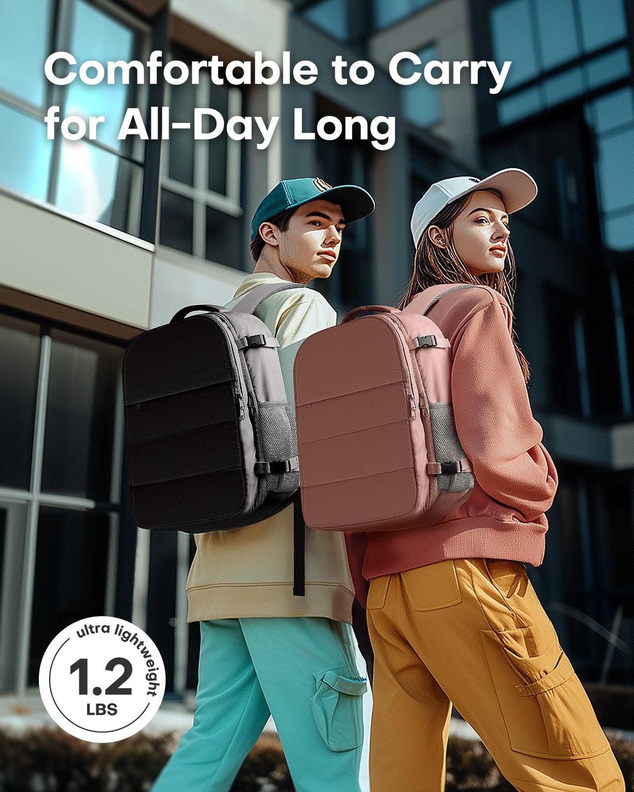 Upgrade your travel game with the laptop backpack! Reliable, stylish, and ready for adventure! 1. 's large travel backpack opens like a suitcase, with elastic inner straps to keep everything secure. It is one of the perfect travel accessories for 3-5 day trips. 2. Made from high-quality, water-resistant Oxford fabric, with dust-proof, durable zippers, this personal item travel bag protects your items from rain, spills, and daily wear. It is a great gift for men. 3. With dedicated pockets, including a padded 15.6" laptop sleeve, wet pocket, and quick-access compartments, this carry-on size backpack is ideal for travel, school, or outdoor adventures. LARGE SUITCASE-LIKE BACKPACK: The travel bag for women features a spacious main compartment that opens like a suitcase, making packing and organizing a breeze. With the elastic inner straps, you can pack clothes, gadgets, and travel essentials without hassle, keeping everything in place. travel backpack is perfect for 3-5 day trips! PREMIUM QUALITY: The backpack for women is crafted from high-quality Oxford fabric that resists water, stains, abrasions, and fading, effectively protecting your belongings from unexpected rain and spills. In addition, the special invisible zippers are dust-proof and not easy to deform, which ensures smooth and long-lasting use. MULTIPLE POCKETS FOR EASY ACCESS: Stay organized with dedicated pockets for every item! The backpack for men includes a padded 15.6" laptop compartment, a wet pocket for wet and dirty items, a quick-access outer zipper pocket for small accessories, and side mesh pockets for water bottles or umbrellas. With its thoughtfully designed pockets, finding what you need is quick and easy. BORN FOR TRAVEL: carry-on travel backpack features a flight-approved size, which fits comfortably in overhead bins or under seats. With a 1.2lb weight, a breathable back panel, and padded shoulder straps, this backpack is lightweight and comfortable to carry even all day long. Besides, the luggage strap can attach the bag securely to the suitcase, freeing your hands. SUITABLE FOR ALL OCCASIONS: The versatile travel backpack for men is ideal for various purposes, including business trips, school, and outdoor adventures. Its sleek, functional design makes it a fantastic gift for frequent travelers, students, or anyone looking for a stylish and reliable backpack for daily life or travel.