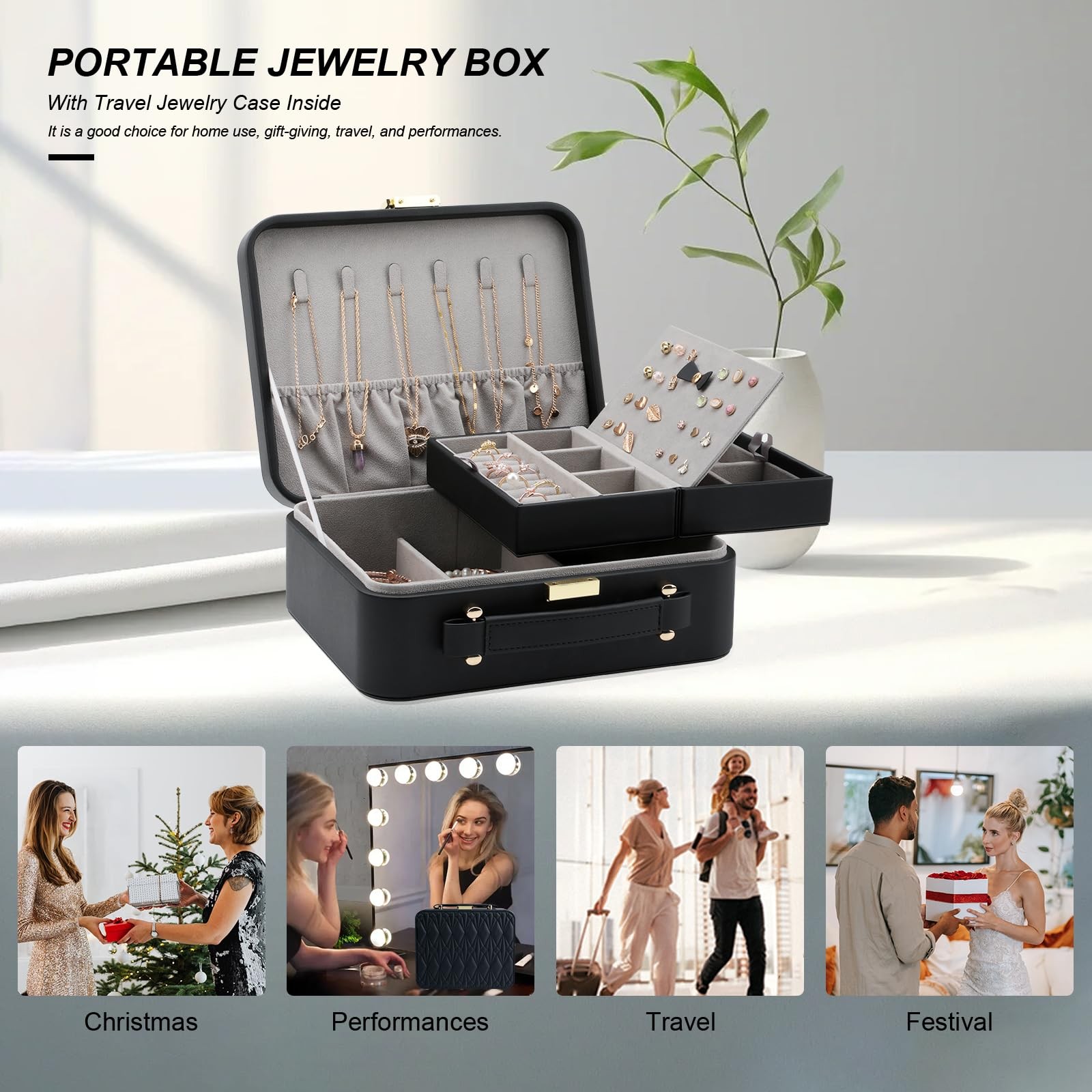 This large travel jewelry case has a beautiful appearance. The small and exquisite design allows it to hold a lot of jewelry and be taken out for travel anytime and anywhere. We designed an inner box for this travel jewelry case to meet your various jewelry storage needs, which you can put in your handbag. This jewelry box is a good gift choice, on important holidays, or as a gift to your girlfriend, mother, or other important women in your life. LARGE TRAVEL JEWELRY CASE - To meet people's needs for carrying jewelry when traveling, we investigated the jewelry cases on the market. Most of them are small and cannot carry much jewelry while traveling. So we designed this large jewelry travel case. PRETTY APPEARANCE - To make our jewelry organizer more design-friendly, we spent a long time using needlework to outline beautiful patterns on the surface of the jewelry box. We have installed handles on the travel jewelry box to make travel easier. REASONABLE LAYOUT - The interior of the Jewelry storage box has 6 compartments 6 necklace hooks, and a necklace bag to prevent necklaces from getting tangled. Apart from that, it also has an inner box. INNER BOX - The inner box has a foldable design. You can take it out on its own and put it in your handbag when traveling. The inner box contains 6 small compartments including an earring board and a ring slot. GIFT IDEAS - We believe this beautiful jewelry holder organizer makes a great gift. You can give the jewelry box as one of the gifts to your girlfriend, wife, mother, or other important women in your life on Valentine's Day, Christmas, anniversaries, etc.