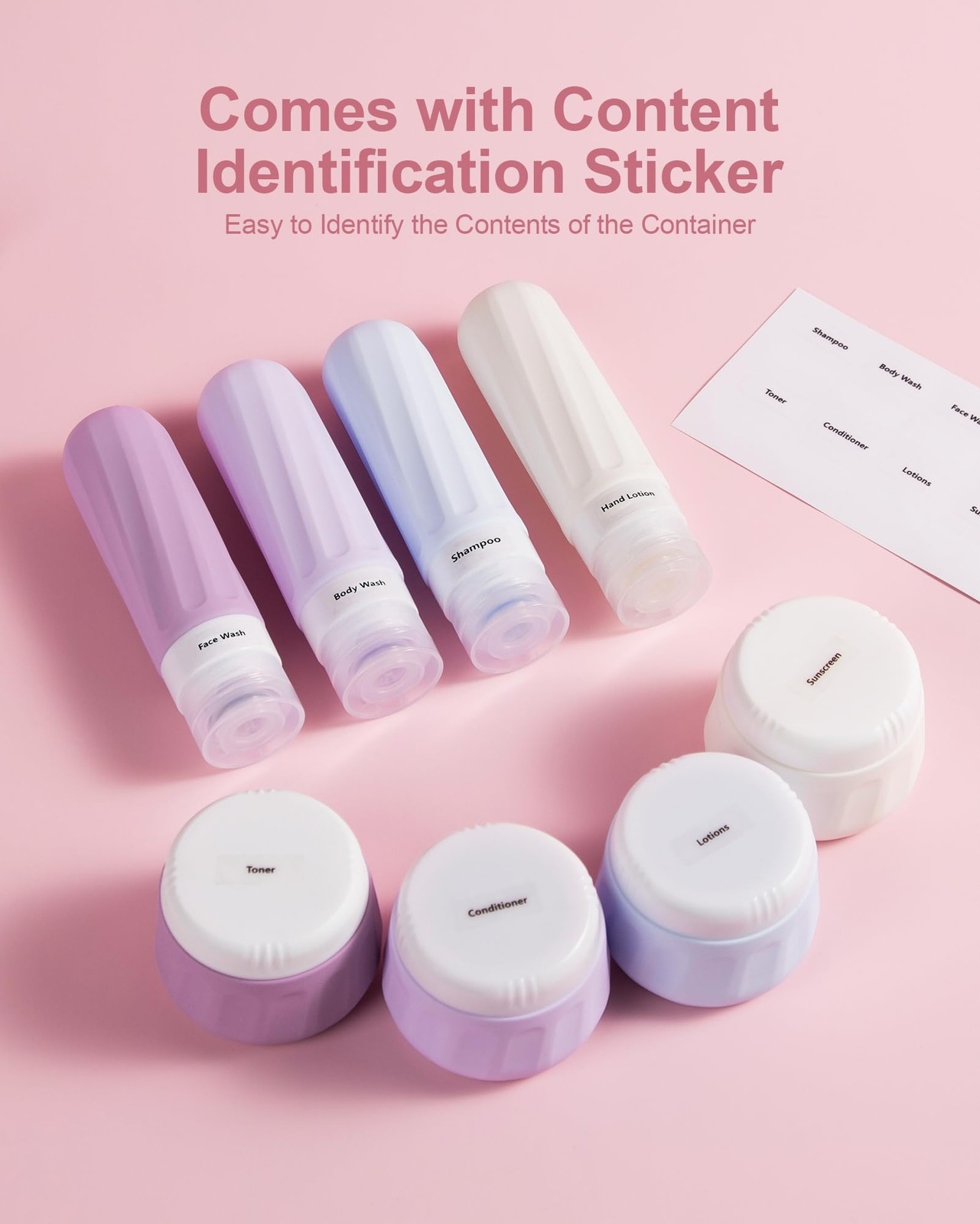 Travel Bottles for Toiletries, Travel Size Toiletries 10 Pack, Tsa Approved Travel Size Containers 3oz, with Travel Essentials Clear Bag, Leak Proof Silicone Squeezable Creams Jars Travel Size Toiletries: Set includes 4 silicone squeeze bottles 3oz(90ml) and 4 silicone cream jars 3oz(90ml) and clear make-up bag 6.46x2.87x5.31inch. Contents identification label sticker TSA carry on approval: A set of travel containers in the same color palette, with capacities of 3oz Squeeze bottle and 3oz travel containers for toiletries, suitable for various skin care products, shampoo, conditioner, cream, body lotion, choose the container to fill according to your needs! Leak proof travel bottle: It adopts three-layer leak proof design, which can prevent liquid leakage or overflow, and is firmly sealed to provide protection for your luggage and clothing without causing confusion. And help you squeeze to the last drop easily. Wide opening design: our refillable travel containers has a large opening, which can be easily filled with shampoo, conditioner or lotion and used, also it easily fits a brush to clean the inside of the tubes. Lightweight and Portable: All travel are packed in a handy Clear Makeup bag, fits in any small space, easy to take on the go and save your toiletry space. Perfect for travel, vacation, plane trip and camp.