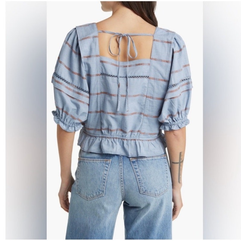 Sweet Treasure & Bond striped embroidered puff sleeve peasant blouse! 100% cotton. Tie back neck. This top is such a nice quality! Measures flat approximately Chest 19" Length 19 •Size: S •Condition: Excellent preowned •Color: blue white rust orange/brown Bundle for combined shipping! Pictures are part of the description. Color may vary by screen. Sizes vary between designers. ALL preowned items can be expected to show normal signs of wear. Smoke free, DOG FRIENDLY home. 10% of net sales go directly to charity at my local food bank. tags: spring summer fall boho bohemian california preppy tennis prep country club garden party polo coastal cowgirl western prairie romantic feminine girlie girly soft girl real authentic designer luxury hippie flower child artist artistic earthy natural rustic cottagecore cabin barn cabincore farmcore trad wife