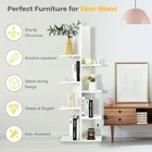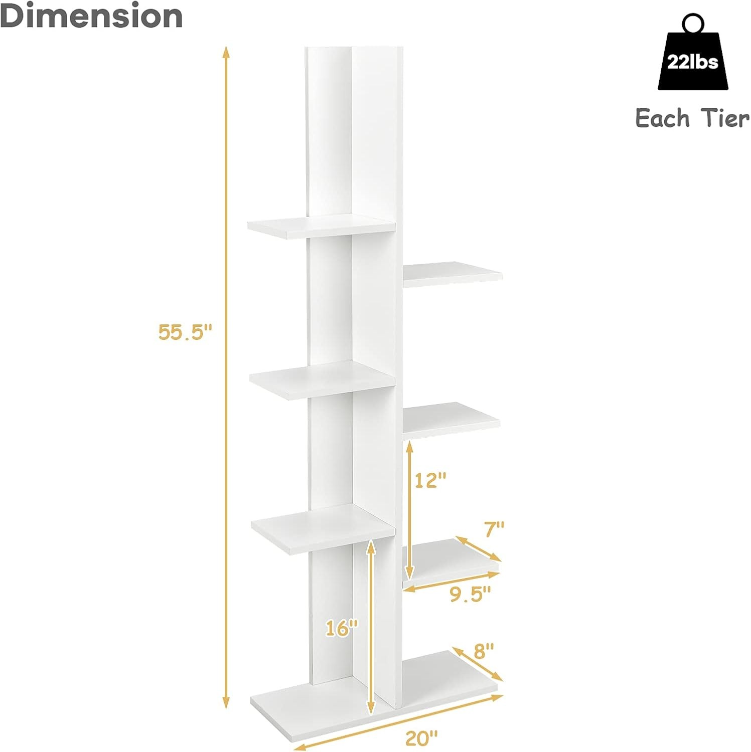 Product Description About this item 【Unique Tree Bookshelf】Unlike normal bookshelves, this tree shaped bookshelf with 8 staggered shelves has a unique appearance. It brings geometric aesthetics and is a great addition to your room. It is a combination of storage and decor. 【8 Shelves for Storage】The tall bookshelf provides plenty of storage space to hold your daily supplies and display decorations. The upper and lower shelves have different heights with the middle ones, which could meet your diverse needs for storage. 【Strong & Stable Structure】Constructed with E0 Grade boards, the whole structure of the small bookcase is strong and sturdy. There is also an anti-toppling device behind and non-slip foot pads under to ensure safety use. 【Easy to Assemble & Clean】With detailed instructions included and all parts labeled clearly, this book tree just requires easy assembly in a short time. In addition, smooth and waterproof surface is easy to clean with some damp cloth. 【Versatile Bookcase for Various Occasions】The overall dimension of 20’’ x 8’’ x 55.5’’(W x D x H) is a great space saver in the room. You can put it in the corner, by the desk or bedside in your living room, study or bedroom. It would surely serve the purpose well. Description If you looking for a versatile bookshelf to keep your daily essentials organized, our unique bookshelf is your great option. It is a combination of aesthetic and function. 8-tier staggered storage shelves provides ample space for storing and displaying collections, books, photos and so on. It can also be used as plant stand in the balcony. Most importantly, simple and modern design makes this bookshelf suitable for any room style and adds aesthetic to your home. Just get one and highlight your place! Features ·Tree shaped bookshelf brings geometric aesthetic ·Skinny appearance for space saving ·8 staggered open shelves with ample storage ·Anti-toppling device for safety use ·E0 Grade boards ensure sturdiness ·Anti-slip foot pads protect your floor ·Detailed instruction easy to assemble ·Smooth and waterproof surface easy to clean Specification Material: E0 Grade Particle Board Overall Dimension: 20” x 8” x 55.5”/50cm x 20cm x 141cm(W x D x H) Net Weight: 23.5lbs/10.65kg Weight Capacity of Each Shelf: 22lbs/10kg Package includes: 1 x Bookshelf 1 x Instruction On Aug 17, 2025 at 19:25:49 PDT, seller added the following information: