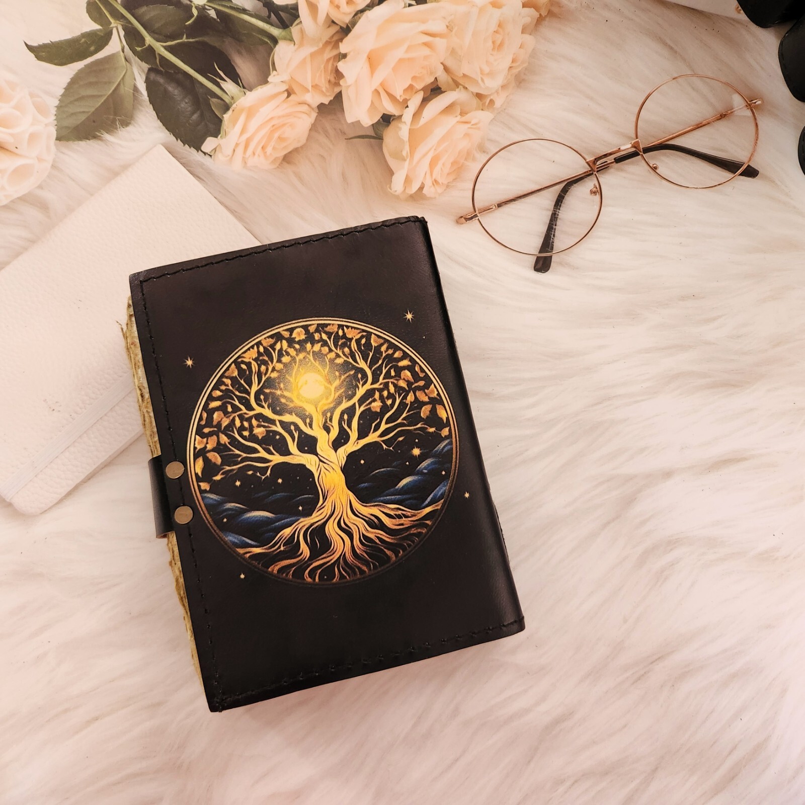 Tree & Moon Leather Journal – Handmade Leather Notebook with Lock Closure Features: ✔ Premium Leather Cover – Crafted from high-quality genuine leather with a rustic. ✔ Unique Tree & Moon Design – Embossed details add a mystical touch, making it a perfect keepsake. ✔ Deckle Edge Pages – 200 handcrafted, unlined pages with a natural deckle finish for a timeless feel. ✔ Secure Lock Closure – Keeps thoughts, sketches, and memories safe. ✔ Multipurpose Use – Ideal for writing, sketching, journaling, or gifting. Available Sizes: 📖 7x5 inches – Perfect for travel and everyday journaling. 📖 10x7 inches – A balanced size for creative writing or sketching. 📖 13x10 inches – Large and spacious for artwork, journaling, or guest book use. 🎁 Great for: Writers, artists, and dreamers Weddings, birthdays, and anniversaries Personalized gifts for loved ones Customization Available! Add initials or a special message for a unique touch. 📦 Fast & Secure Shipping – Delivered with care. ✨ Handmade with Love – Each journal is one of a kind.