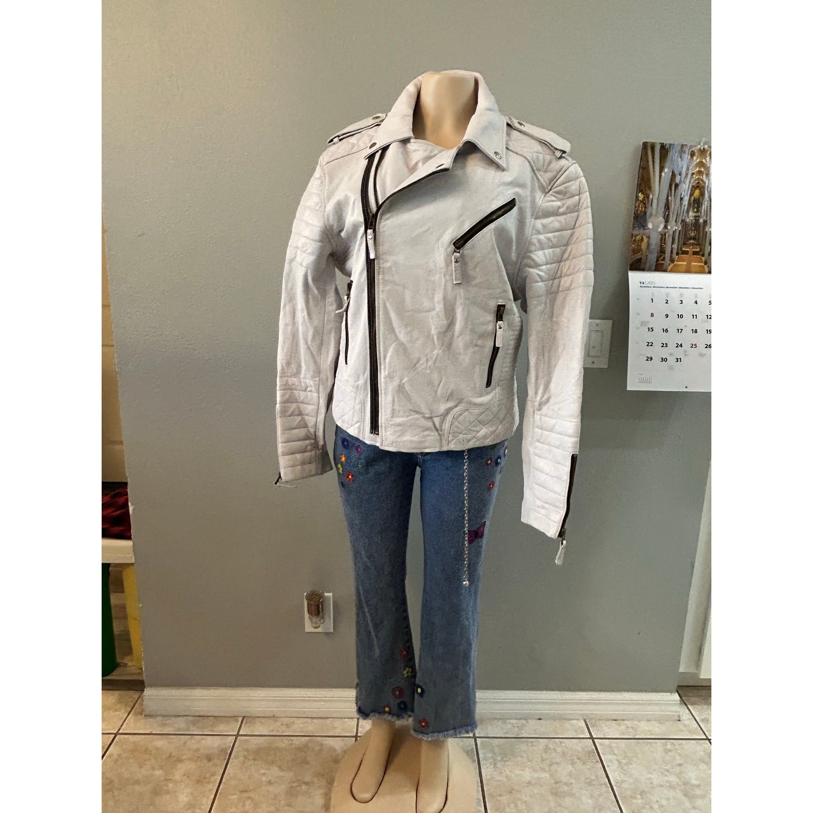 High-quality genuine leather moto jacket in a soft white shade with black contrast zippers. Features quilted shoulders + sleeves, asymmetrical front zip, zip cuffs, three zip pockets, and shoulder epaulets. Fully quilted inner lining. No size or brand tag, but based on measurements it fits like a Women’s XL (may also fit some XXL depending on preferred fit). Measurements: • Shoulder: 18” • Chest (pit to pit): 22” • Sleeve: 19” • Length: 25” Condition: good, light wear typical of real leather.