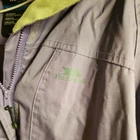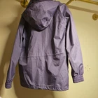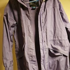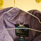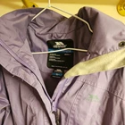This Trespass TP50 ladies jacket is waterproof and windproof, suitable for travel, casual wear, or workwear. Made of softshell polyester material in a mid-length style with a floral pattern in purple. Features long sleeves, a zip closure, and the Trespass logo. Ideal for outdoor activities in all seasons, it has a polyester lining and insulation. The size is S (id say 8 to 12) is worn so has some marks please see photo