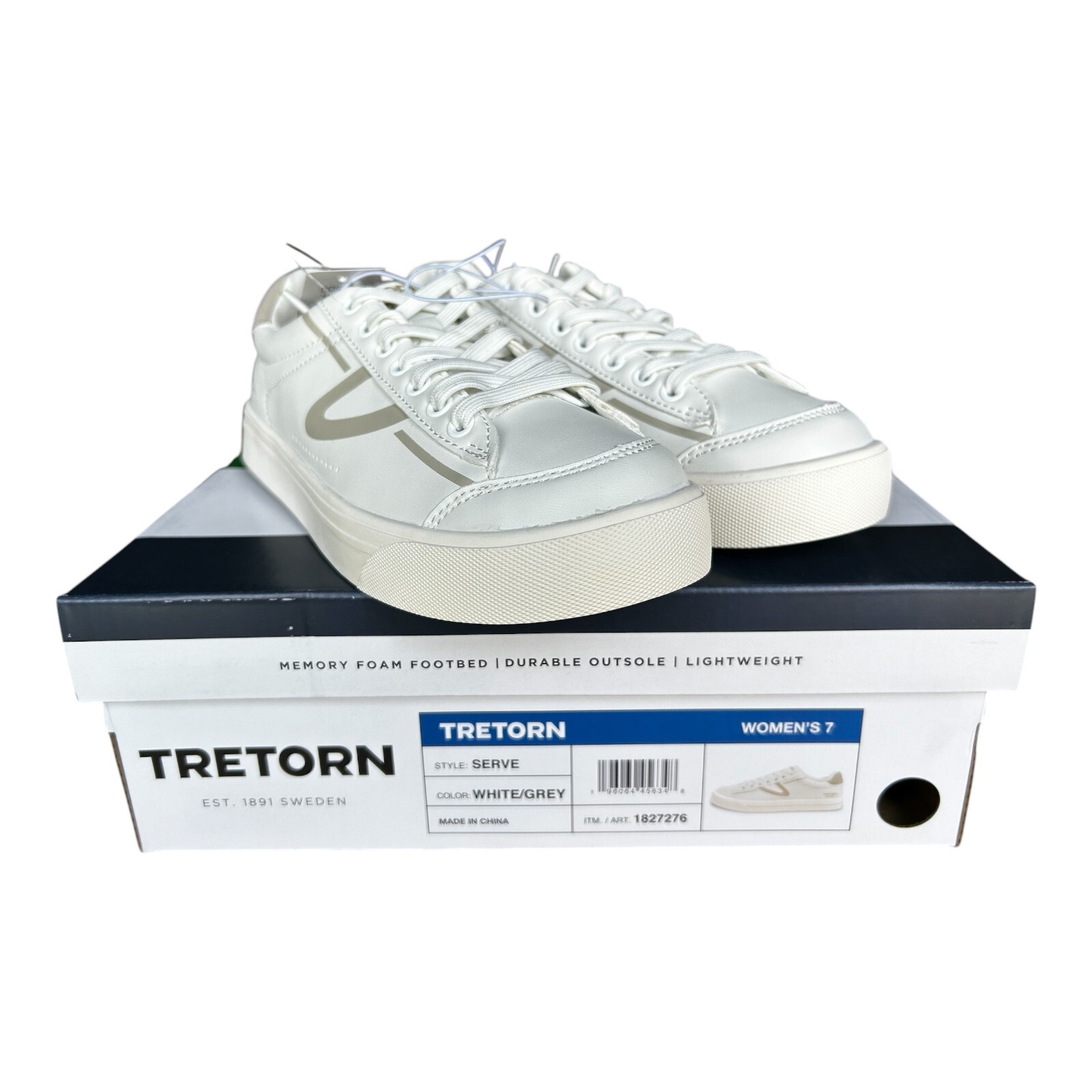 Features: Memory Foam Insole Padded Collar Colors: Gray (White/Gray) Rubber outsole Lace up closure Gray Tretorn gull wing logo design Made in China Content: Upper: 100% Polyurethane Lining: 100% Polyurethane Outsole: 100% TPR Care Instructions: Wipe clean with a dry cloth