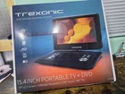 The Trexonic Portable 15.4 Inch TV+DVD Player in black features a compact LED screen that offers crystal-clear visuals. With connectivity options like USB, HD, and AV, this portable device allows you to easily connect and view your favorite media on the go. Perfect for watching movies or TV shows while traveling or on-the-move, this versatile device is a convenient and reliable choice for entertainment.