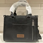 This Trinity Ranch Black Tote Crossbody features hair on cowhide with tooling accents and fur trim. It includes a concealed carry pocket, inner pockets, and a detachable strap. The bag has a Western theme, double handles, and a pewter hardware color. Perfect for travel, weddings, casual outings, or business use. Made of leather with black lining and exterior. Ideal for women who appreciate quality and style from the Montana West brand.