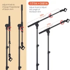 Stable Tripod Base: tripod boom microphone tripod legs extends further than others which can stand holds microphone securely in place. Non-slip foot cover prevent it from moving around. Carrying Bag & Universal Mic Clips: it comes with carrying bag and 2 mic clips: barrel style & clothespin style, fits for most types of microphones. Stand Height Adjustable: microphone stand height can be adjusted from 25.2”/64cm to 62.2”/158cm, perfect floor use mic stand for stage performance, speeches, meeting rooms, party, wedding, karaoke sing or live broadcasts etc. Extendable & Removable Boom Arm: boom arm extends freely within 16.9”-30.1” (43cm -76.5cm) and 360° angle rotatable through adjustment knobs which allows for easy positioning. Simply remove the boom arm and attach microphone clip to convert the mic stand into a traditional straight mic stand. Portable and Easy to Assemble: all parts could be stored in a provided carrying bag for convenient transport.