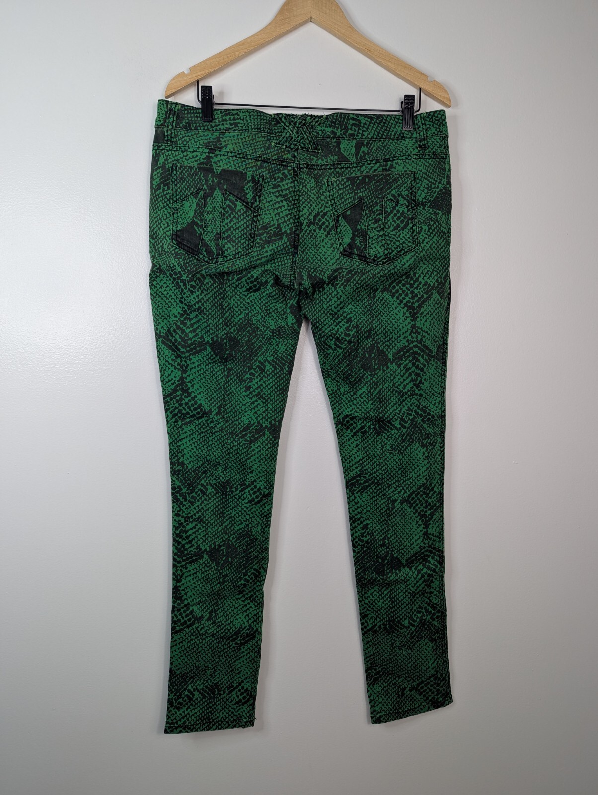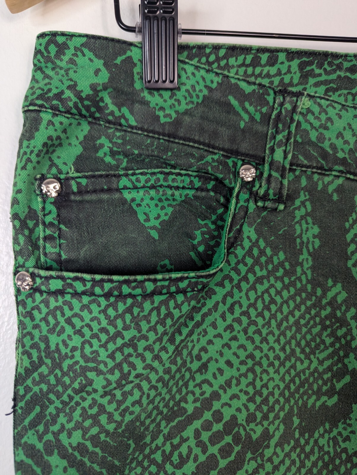 Tripp NYC Green Snakeskin Print Low Rise Skinny Jean. Has skull studs on front pockets, braided belt loop detail in back. Pre-owned, in good condition with no noticed flaws SIZE: 11 (Junior's, equivalent to women's 10/30) MEASUREMENTS: Length- 40" Inseam- 32" (More measurements last pic) JAN25