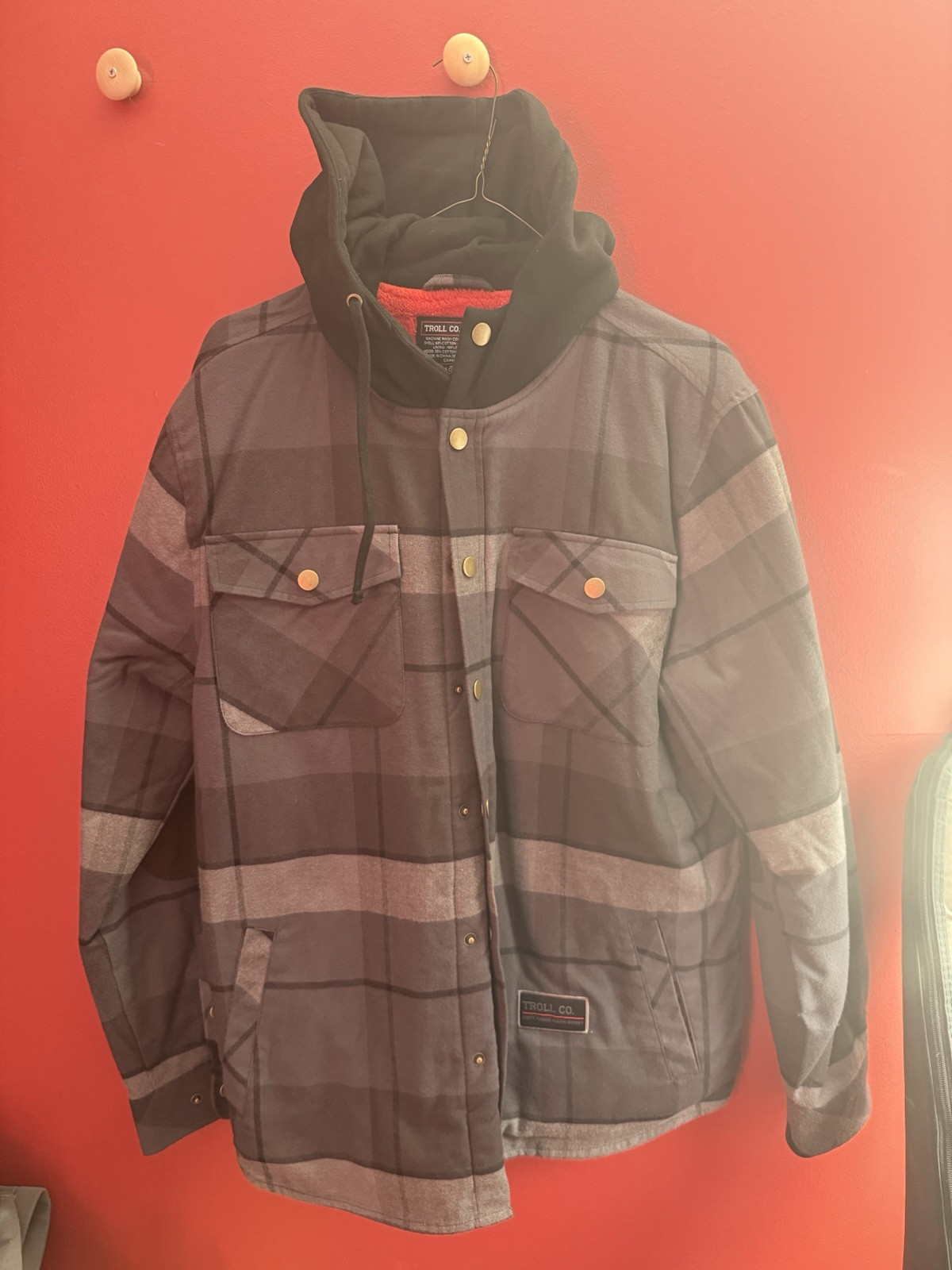 Troll Co. Men's Buford Snap-Front Hooded Flannel Jacket The new hooded flannel combines warmth and comfort for those chilly days. 60% Cotton, 40% Polyester Fleece-Lined Hood with Shoestrings Lined Hand Warmer Pockets Extra Soft Sherpa Lining Snap Front Closure