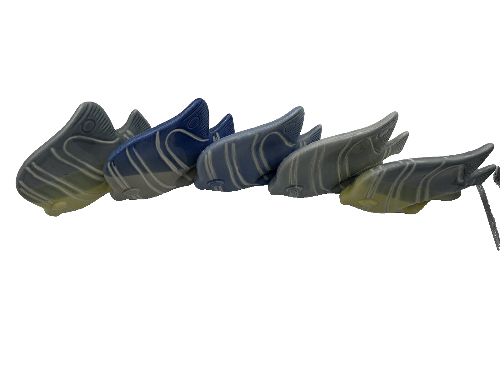 Add a splash of color to your décor with this School of five ceramic fish statues. These tropical fish are beautifully crafted in shades of light and dark blue, and yellow, creating an eye-catching display. Made of high-quality ceramic, these statues are durable and long-lasting. Perfect for collectors or anyone who loves marine life, these figurines will make a great addition to your collection. @4.5" x 6"