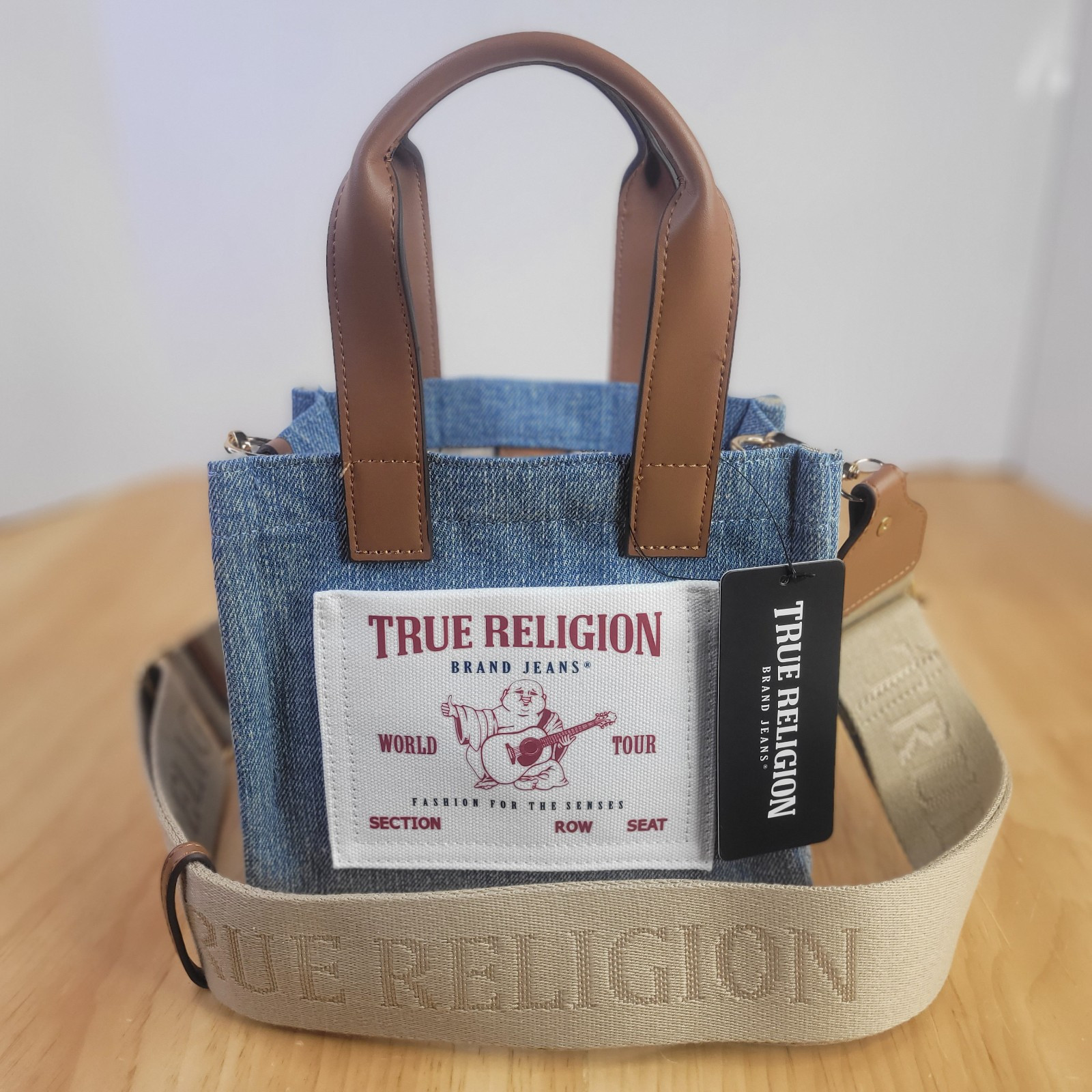 This True Religion shoulder bag is a small-sized tote made of denim in a stylish denim blue color. The bag features a square shape with a snap closure and brown shoulder straps. It includes a detachable strap for added versatility and has silver hardware accents. The exterior is adorned with a logo applique, giving it a designer and classic look. The bag is perfect for travel or casual occasions, making it a fashionable and functional accessory for women looking for a trendy denim handbag.