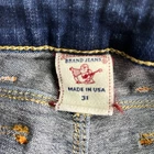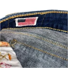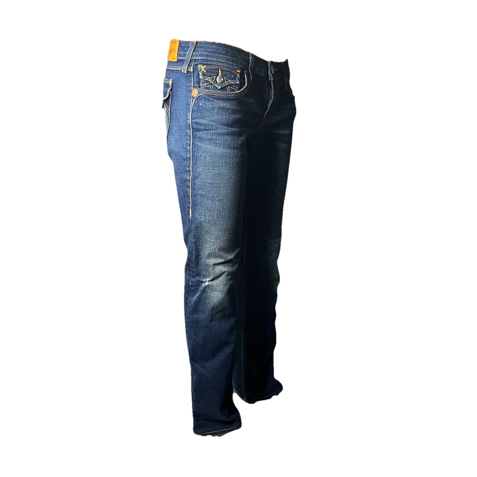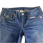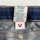 The True Religion Billy Straight Flap women's jeans are a stylish and classic choice with a dark wash and solid pattern. Made in the USA, these jeans feature a regular fit and straight leg style with a low rise. The denim fabric is durable and comfortable, while the zip closure and flap back pockets add practicality to the design. In a timeless blue color, these jeans showcase a sleek and versatile look that is perfect for everyday wear or a more dressed-up occasion.
