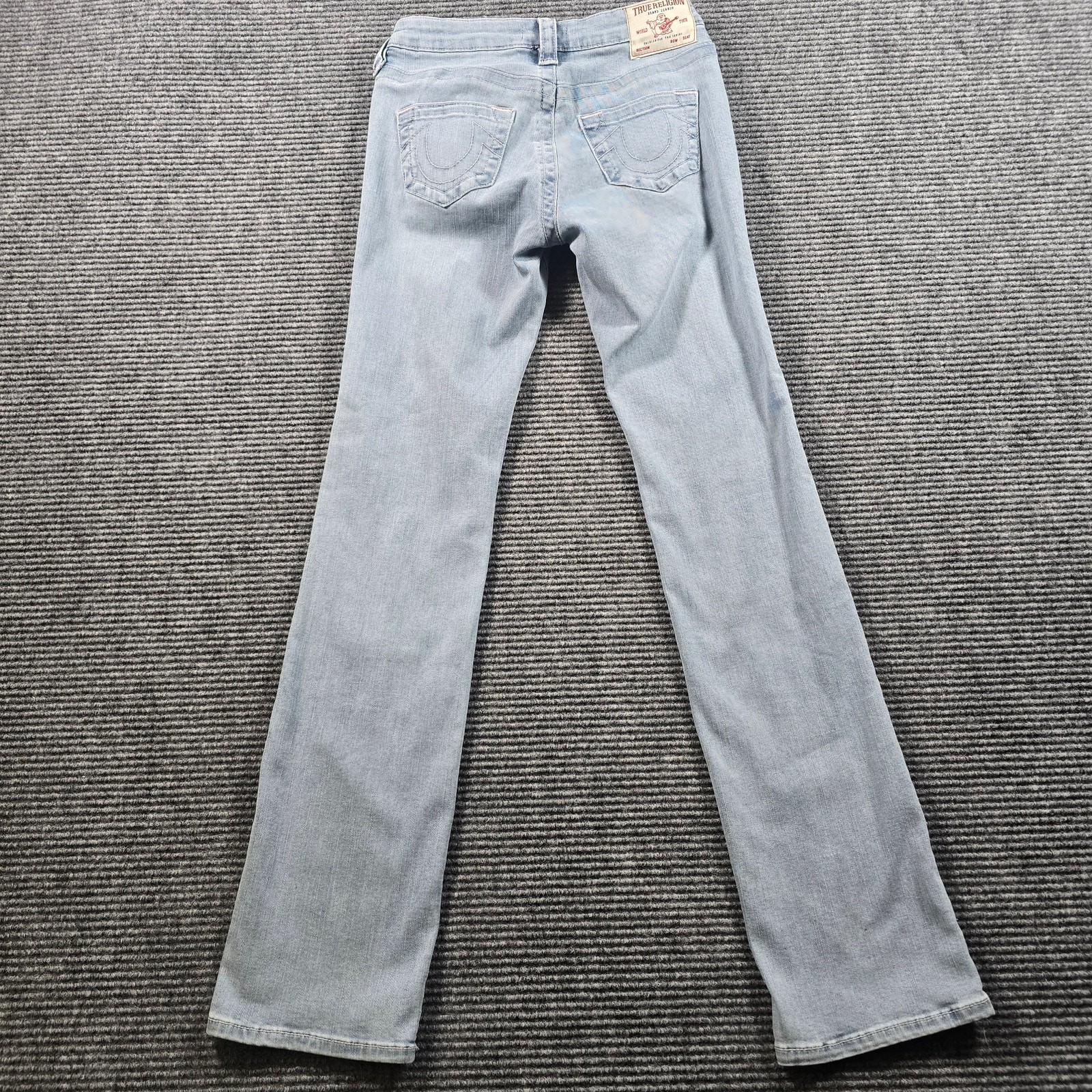 True Religion women’s Billie mid-rise straight leg jeans in a light blue wash with subtle distressing for a worn-in look. Classic five-pocket design with signature horseshoe stitching and a flattering straight silhouette that works year-round. Easy to dress up or down with sneakers or boots. Color may vary slightly from photos due to lighting and monitor settings. Details Brand/Model: True Religion Brand Jeans – Billie Style: Mid Rise Straight Color/Wash: Light Blue Size: Tag size 25 Fabric: 68% cotton / 24% polyester / 2% elastane Condition: Pre-owned; light distressing by design Key Note: Billie mid-rise straight, subtle distressed details Measurements (from tape): Inseam: approx 32"