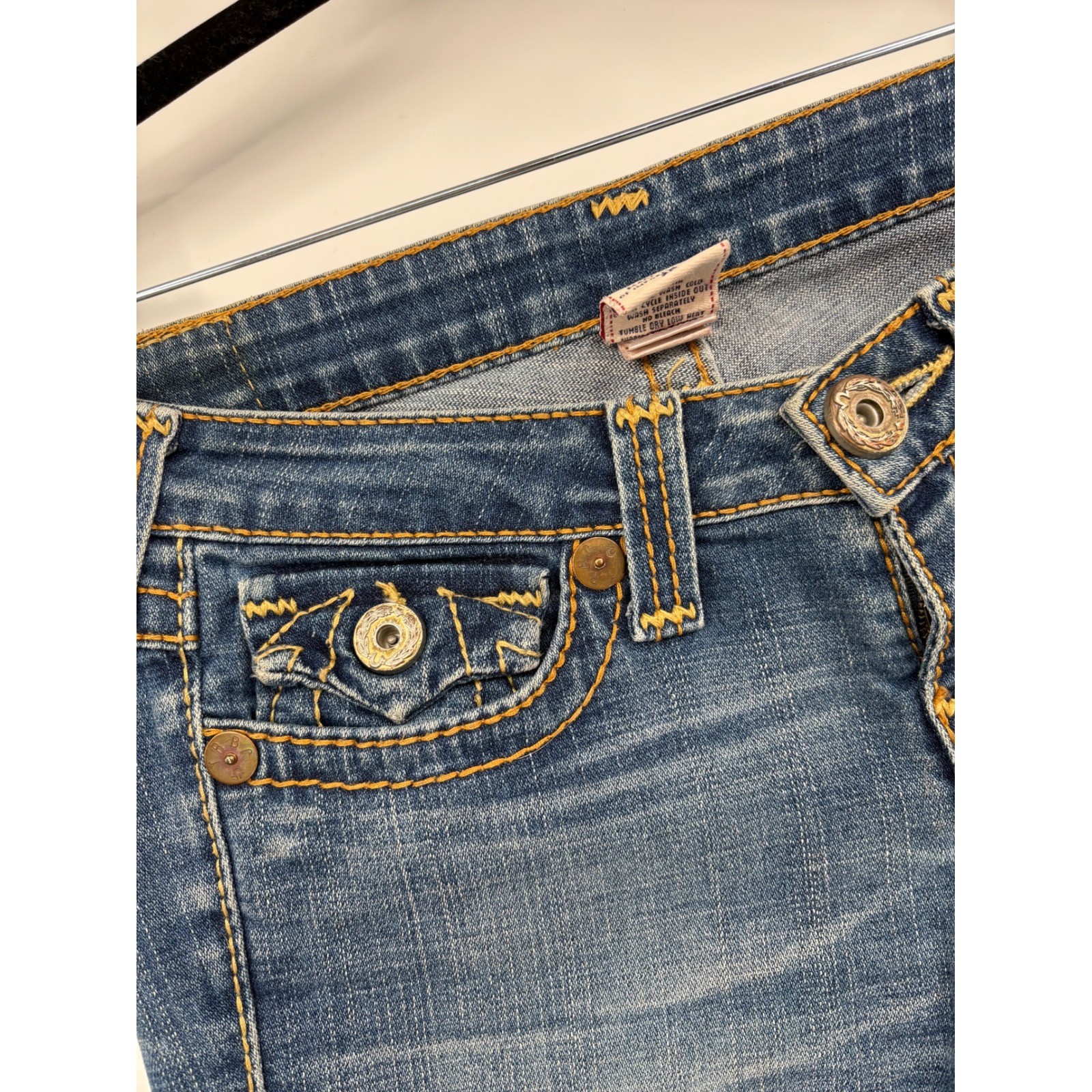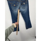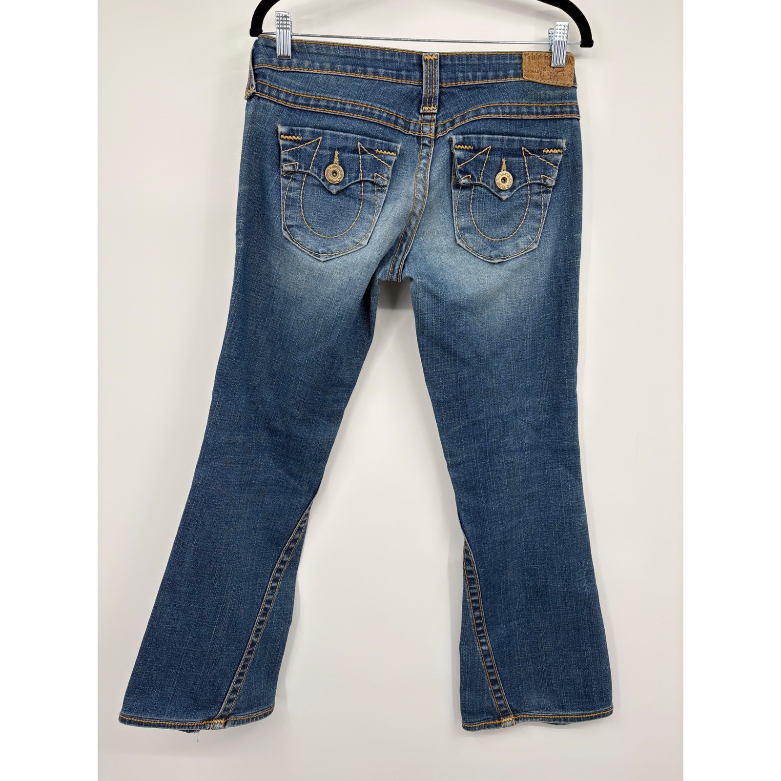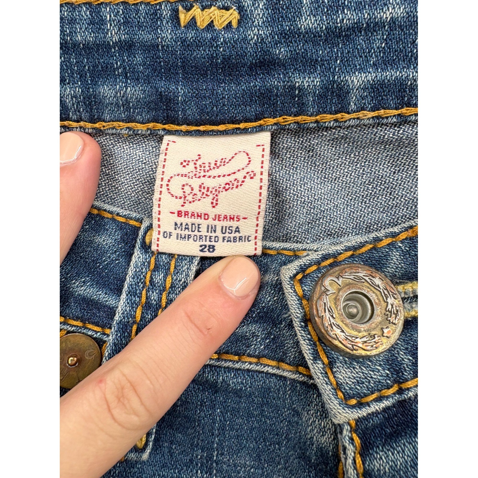Iconic True Religion Joey bootcut jeans redefine casual denim with their signature horseshoe stitching and perfect blend of comfort and style. Crafted with a flattering bootcut silhouette, these jeans offer a timeless appeal that transitions effortlessly from day to night. The subtle whiskering and fading add a touch of lived-in character, making them a go-to for any occasion. Perfect for a weekend brunch or a casual concert. Measurements: • Waist: 28 in • Inseam: 30 in • Rise: 7 in • Leg Opening: 8 in Style: Flared Department: Women Fabric Wash: Medium Waist Size: 28 in Type: Jeans Accents: Logo, Button Features: Pockets, Distressed Fit: Slim Pattern: Solid Rise: Low (6.5-8.5 in) Fabric Type: Denim Material: Cotton Blend, Spandex Closure: Zip, Button Theme: USA Product Line: True Religion Desert Mirage
