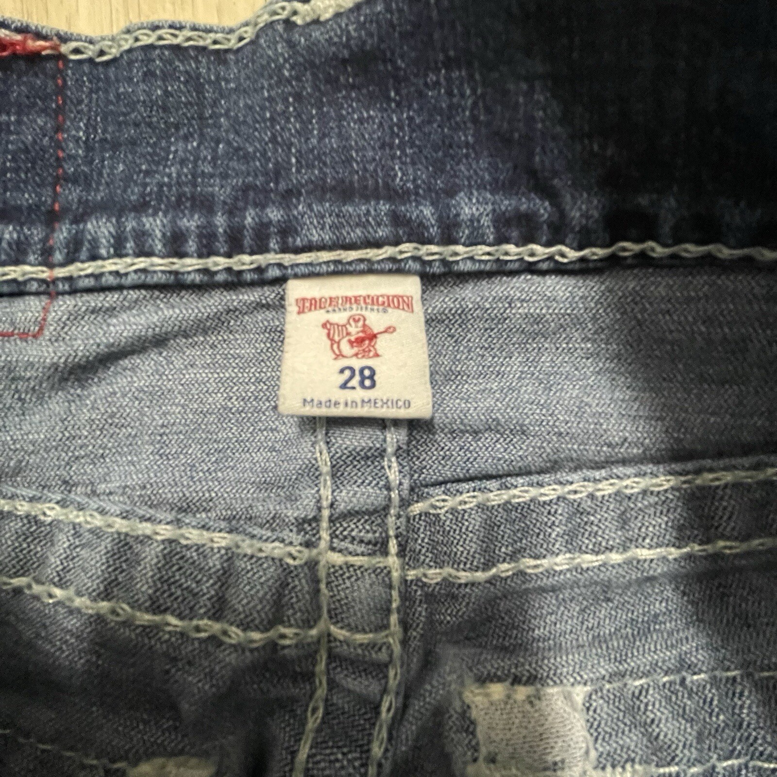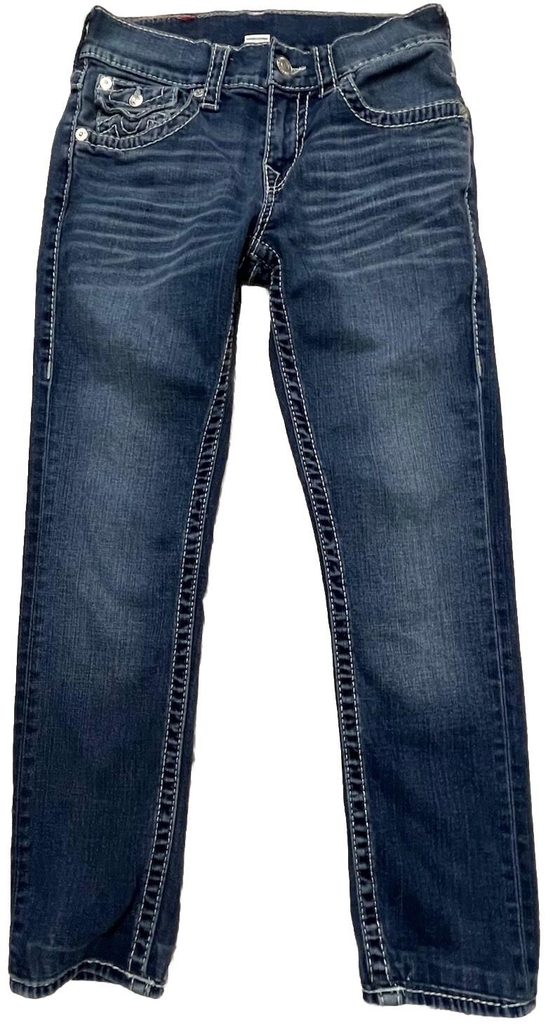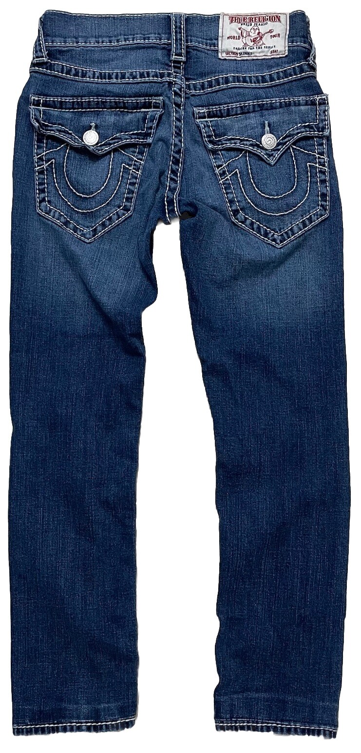 Elevate your denim game with these True Religion Super T skinny jeans. Crafted from a cotton blend fabric, these jeans feature a low rise waistline, button and zipper closures, and flap pockets. The dark wash and solid pattern make them a versatile addition to your wardrobe, perfect for any season. These jeans are a size 28 with a 32.5 inch inseam and slim fit. They are part of the True Religion World Tour product line and were made in Mexico. With accents like buttons and a zipper, these jeans are perfect for anyone looking for a stylish and functional addition to their wardrobe.