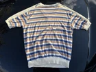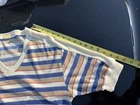 This True Vintage Brittania Striped Shirt Top for Men in XL features a classic V-neck design with short sleeves, perfect for a retro 1970s look. Made of terry cloth material, this multicolor shirt is ideal for all seasons and adds a touch of nostalgia to any outfit. The double-sided pattern and regular fit make it a versatile piece that can be worn in summer, fall, or spring, showcasing the brand's vintage charm. Made in Taiwan, this t-shirt is a must-have for those who appreciate 70s retro fashion.