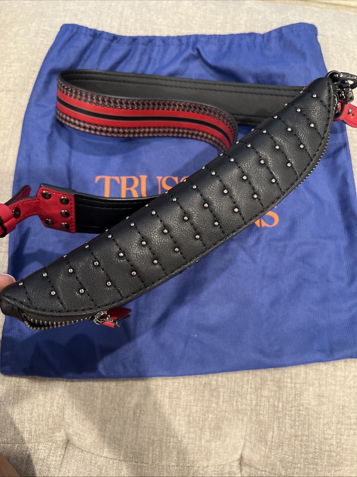 The Trussardi Crossbody Bag is a stylish and practical accessory for women, perfect for everyday use. Made from high-quality leather in a sleek black color, this small oval bag features a crossbody strap with silver hardware for a touch of elegance. The adjustable strap allows for comfortable wear, while the detachable strap offers versatility in styling options. Crafted in Italy, this Trussardi bag exudes quality and sophistication, making it a must-have for any fashion-forward woman.