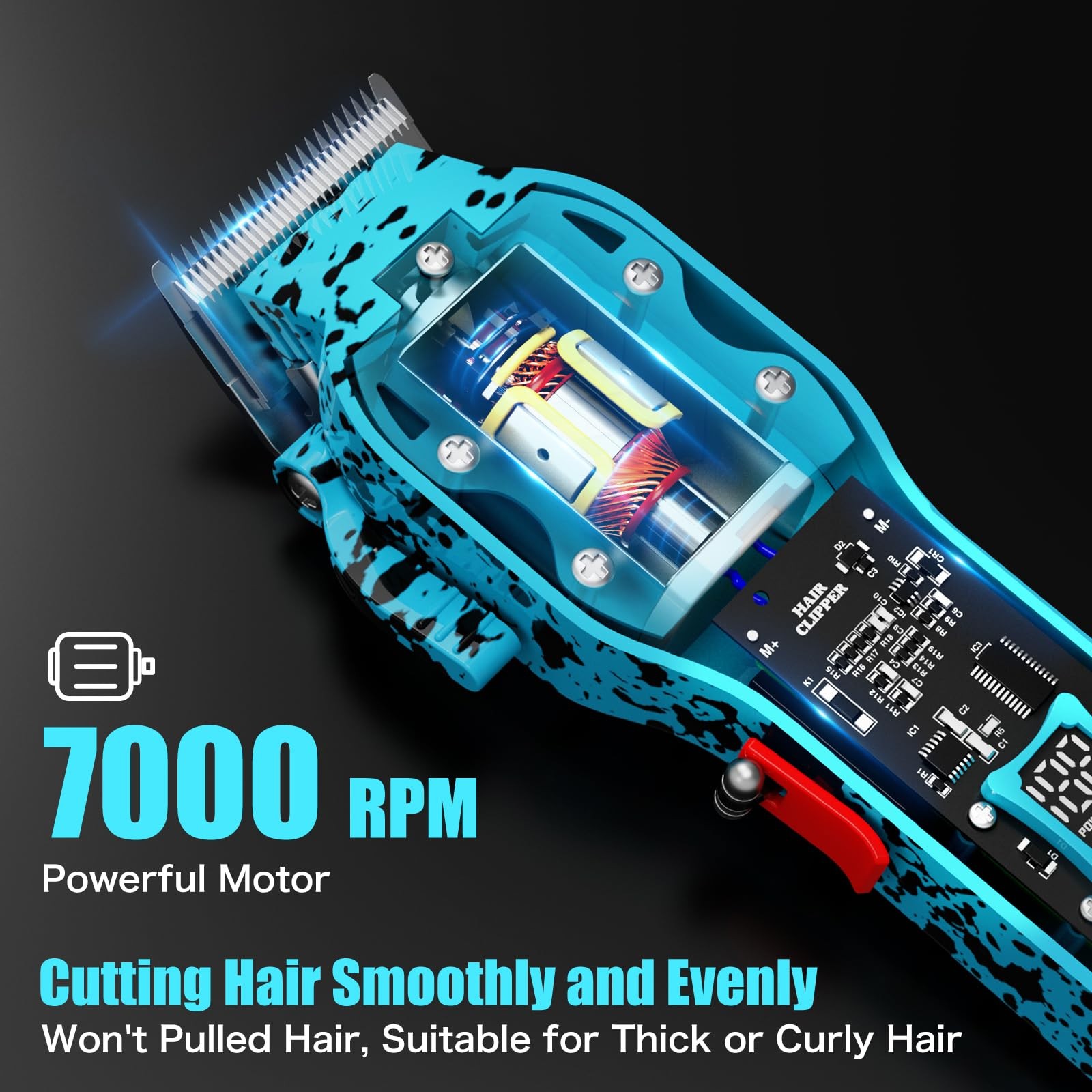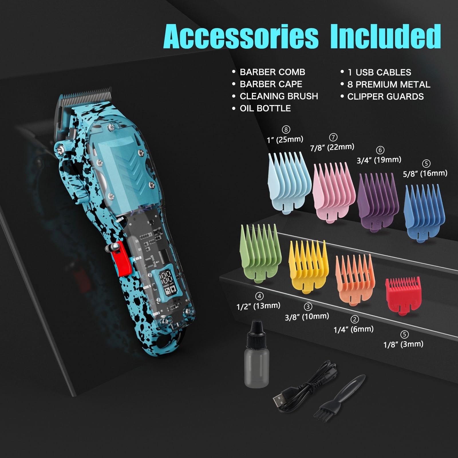 Tuanchuanrp Professional Hair Clippers for Men, Cordless Barber kit Blue Description Features: [HIGH POWER MOTOR& SHARP STAINLESS STEEL BLADES] Equipped with a 7000RPM high-speed motor and sharp stainless steel blades, this hair clipper makes extended grooming sessions a breeze. The motor with less than 60dB of noise provides a pleasant and quiet shaving experience while you are using it. [LED DISPLAY SCREEN] Lithium-Ion battery with Fuel gauge to tell how much power left. The trimmer comes with a rechargeable, 2000Mah high-capacity battery that lasts at least 300 minutes on a 3-hour charge. [PACKAGE INCLUDED] The hair clipper comes with 8 guide combs (1/8’’, 1/16’’, 3/8’’, 1/2’’, 5/8’’, 3/4’’, 7/8’’, 1’’) for the hairdresser, cleaning brush, as well as DC and USB charge cable for the detail trimmer, bringing you a perfect effect. [NOVEL Transparent design] Transparent hair clippers are unique, fashionable, and innovative. The hair clipper is made of high-quality materials to ensure durability and long-lasting use. Product Details: Handling We will ship all orders within 1 business day of payment. Delivery We Do Not Ship Outside of the Continental US. Return Policy All items qualify for returns within 30 days of receipt. Buyer is responsible for return shipping on any item that is not damaged. Feedback We take our reputation seriously, we buy and sell online, so we understand the value of trust. If you are unsatisfied with your order, please contact us and we will work with you to resolve it to your satisfaction.