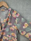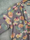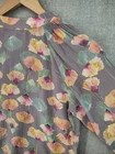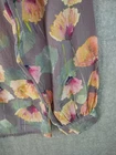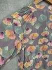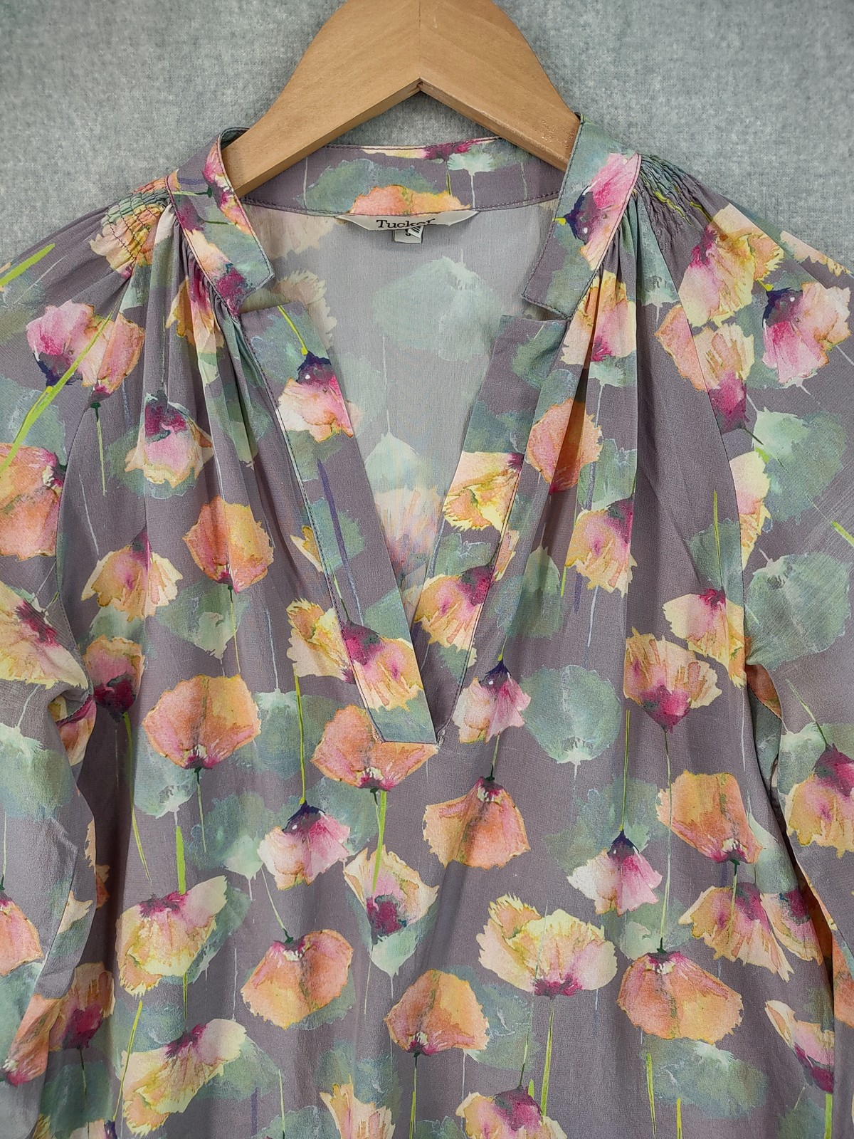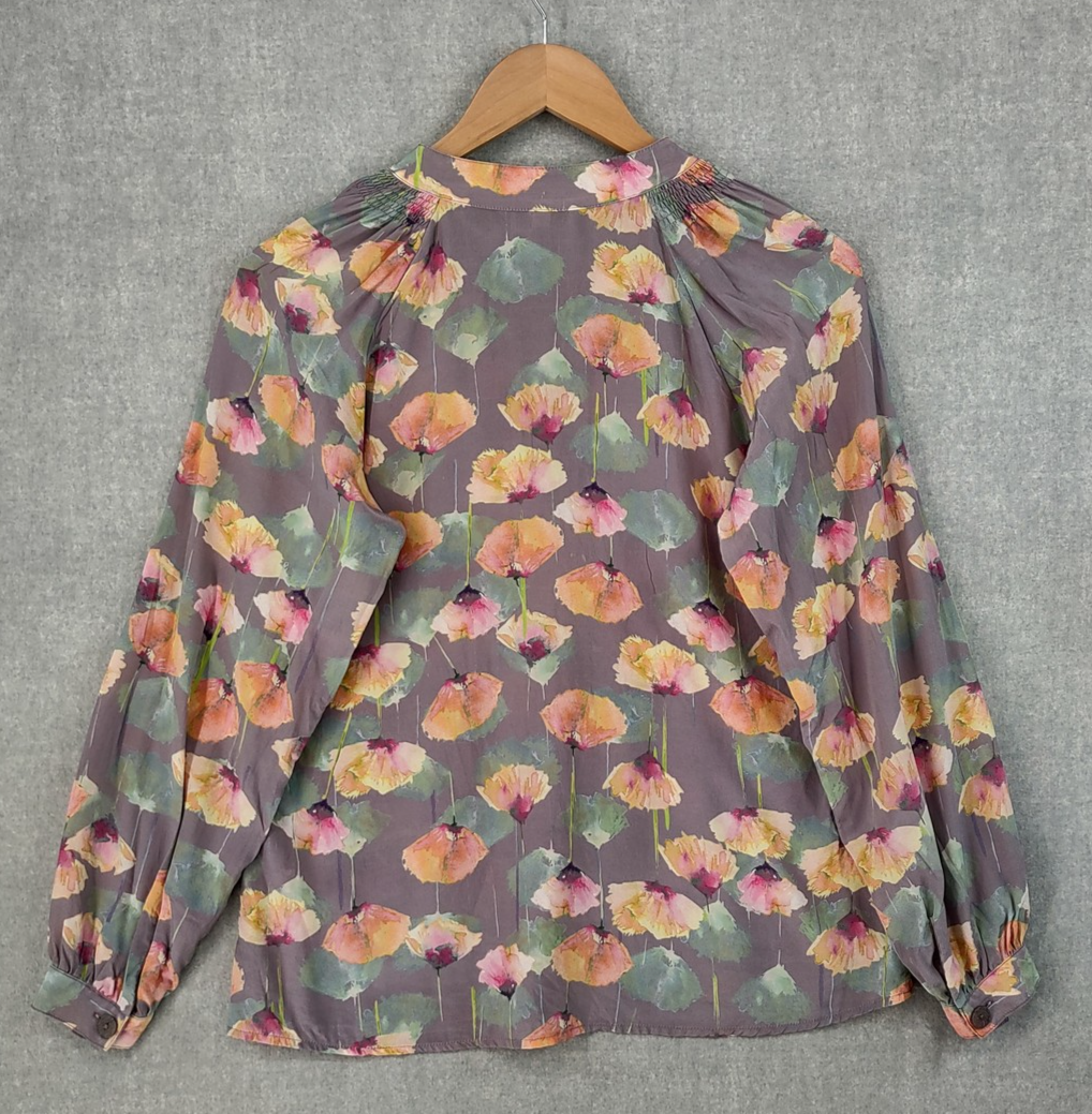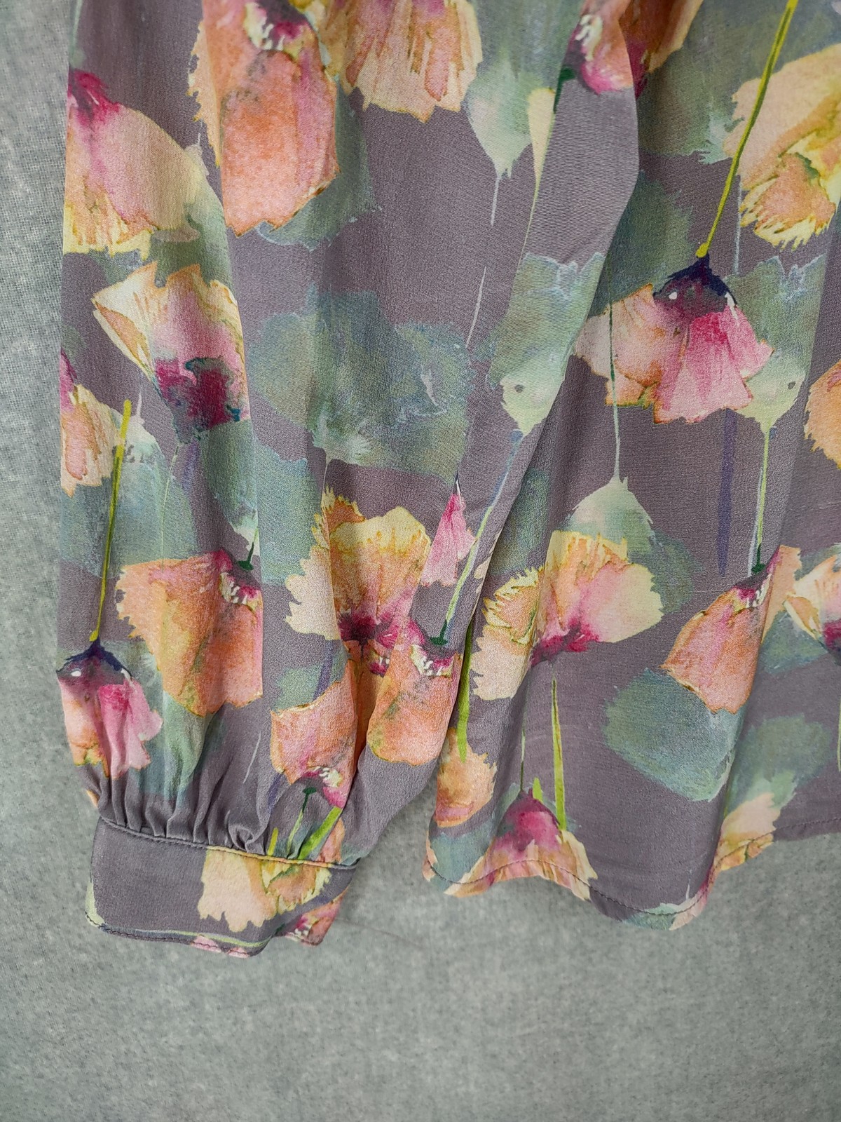 Welcome to Aspen Crossing, the place for modern western bohemian style reflecting the rugged beauty of our American West Tucker Blouse Womens Small Purple Floral Silk Long Sleeve Sheer Top Made USA Condition: Good pre-owned condition. Light wear with no major flaws but note small loose thread at the base of the V-neck as shown in close-up photo. Material: 100% Silk. Lightweight and semi-sheer fabric with a soft drape. Features a beautiful watercolor floral print in purples, corals, pinks, greens, and yellows. Deep V-neck, gathered pleat details at shoulders and back yoke for subtle volume. Long sleeves with single button cuffs, relaxed fit, unlined, pullover style. Brand: Tucker (see photos for brand and size tags) Size: Small (Womens, tag size S) Care: Dry clean only (Nettoyer à sec seulement) Made in USA (Fabriqué aux Etats-Unis) Approximate flat lay measurements are provided in final image for reference. Perfect for dressy casual, office, or special occasion layered over a camisole. Please note: While every effort has been made to reproduce actual colors in photos, variations may occur on your screen. Custom SKU: 54-70965