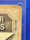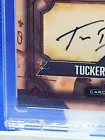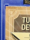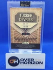 The product is a Tucker Devries rookie sports trading card from the 2021-22 season. It is an autographed card with a red parallel variety, featuring a unique serial number of 1/2, making it a one-of-one card. The card is part of the National Collegiate Athletic Association (NCAA) League and showcases Devries as a player for either the Ohio Bobcats or West Virginia Mountaineers. Manufactured by Panini, this limited edition card is highly collectible and sought after by fans and collectors alike.
