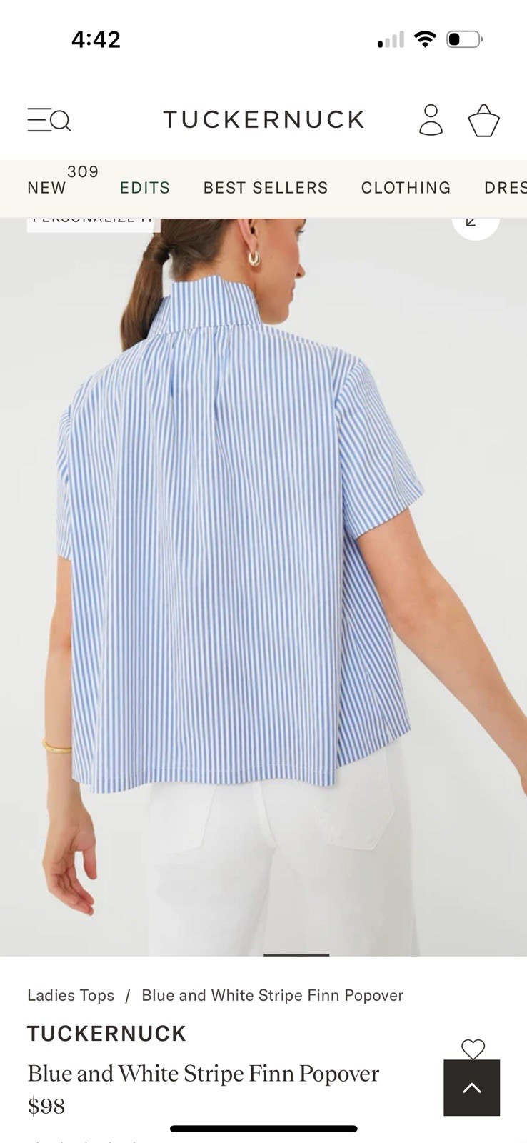 This popover shirt is a total wardrobe staple—effortlessly chic and so versatile! The blue and white stripes are crisp and fresh, while the stand collar and shoulder pleats add a polished touch. It fits perfectly, feels comfortable, and transitions seamlessly from work to weekend. Love how it pairs with everything from tailored pants to jeans. The quality is fantastic, and it’s in flawless condition. A must-have piece!
