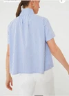 The Blue and White Stripe Finn Popover is a sophisticated, easy, and flattering style all wrapped into one. Featuring a stand collar, partial front button closure, and pleating along the shoulders, this classic silhouette can be worn over and over again. Pair with ballet flats for the office, or with denim and sneakers for a casual day out and about. Excellent condition.