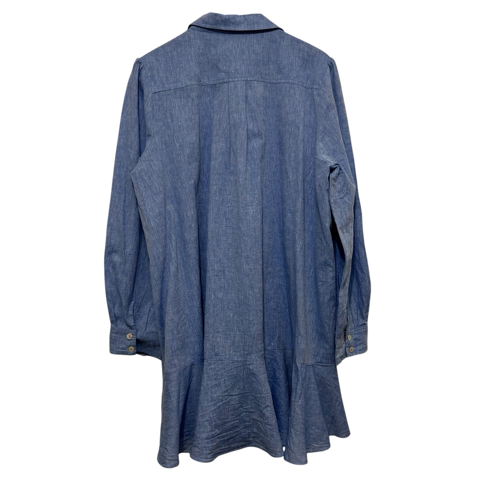 Approximate measurements: Across underarms - 24" Length - 36" -button up half placket, button cuffs, side seam pockets, flounce hemline, swing shape Great preowned condition