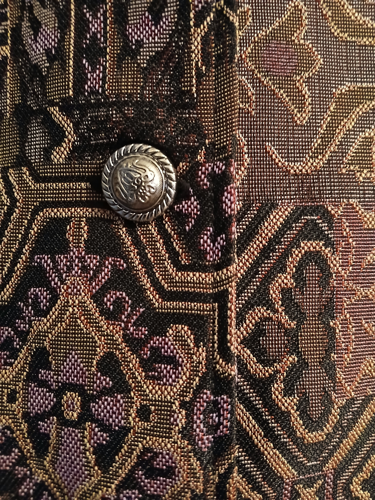 This is a Tudor Court Vintage Jacket Blazer for women in size XL. It features a tapestry design in a unique multi-color pattern, a vintage style, and a collared neckline. The blazer is made of lightweight polyester, suitable for all seasons. It also includes button accents, perfect for adding a stylish touch to any outfit. It is missing a tag, but the extra button is still sewn in so you can tell it has not been worn.