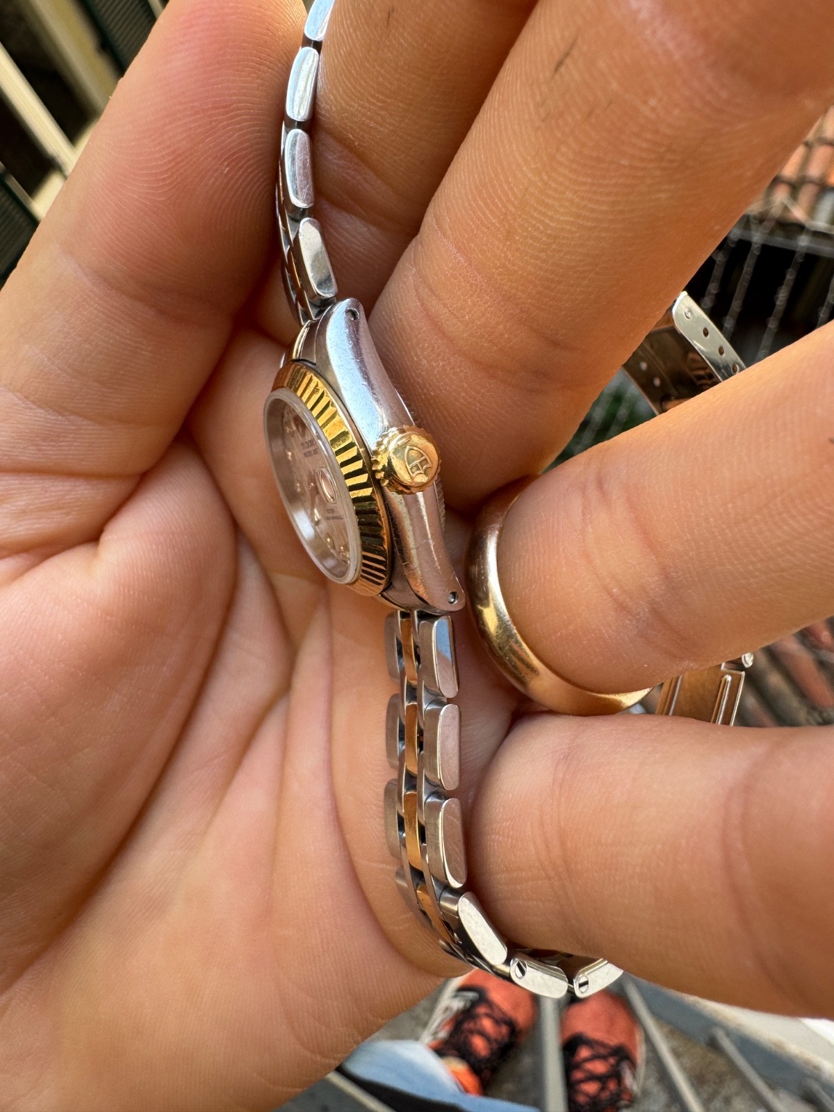 PROPONIAMO; -Marca: TUDOR PRINCESS DATE -Cassa: ACCIAIO DA 23MM ESCLUSA CORONA , FONDELLO A VITE -Movimento :ORIGINALE TUDOR SU BASE ETA AUTOMATICO -Vetro:ZAFFIRO -Corona:ORIGINALE TUDOR A VITE -Ghiera: ORO GIALLO -Tasti: NO -Quadrante:SILVER , INDICI DIAMANTI -Lancette: ORO -Cinturino/Bracciale:ACCIAIO E ORO ORIGINALE FINALI 617 B, ADATTO PER POLSI FINO A 16,5/17 CM -Scatola e documenti: NOSTRA POCHETTE IN VELLUTO COMPRESA + GARANZIA E PORTA DOCUMENTO ORIGINALE TUDOR -Condizioni : OTTIME , QUALCHE SEGNO SUPERFICIALE -Revisionato:SI -Uomo/donna/unisex:DONNA PER QUALSIASI DUBBIO CONTATTATEMI ,RISPONDEREMO IL PRIMA POSSIBILE