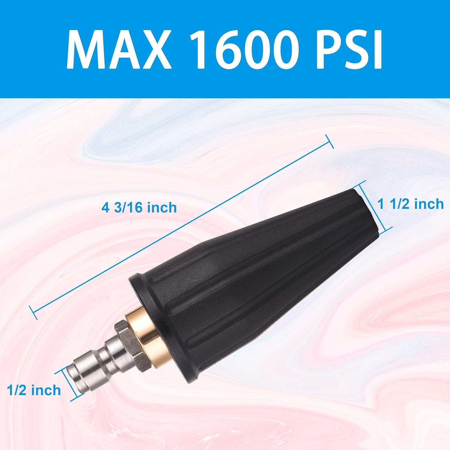 WORKING PRESSURE DO NOT EXCEED 1600 PSI. Powerful Strike: Pressure washer rotating turbo nozzle use centrifugal force to produce a strong impact and a spray pattern. The turbo jet power washer nozzle spray creates a powerful jet of water, adds additional scrubbing ability to the cleaning process. WORKING PRESSURE DO NOT EXCEED 1600 PSI. Widely Application: Power washer rotating nozzle is ideal for cleaning heavily soiled bricks and large amounts of dirty. Such us concrete, block, brick, pavers and most durable outdoor surfaces. Great for rust removal, metal or plastic tank cleaning, boat cleaning, cleaning dirty garage floors. Also for your car, cars rims, house and gutter. Designed for cold water pressure washers. WORKING PRESSURE DO NOT EXCEED 1600 PSI. Save Time: Turbo pressure washer nozzle cleans up to 40% faster than standard nozzles. These nozzle turbo help in reducing cleaning time by utilising the rotary action of an 0° stream and a wide angle spray pattern. Attention: When you find the nozzle can not work for a long time. Pls disassemble the nozzle, clean the inside thoroughly. High Quality Turbo Spray Nozzle: The pressure washer nozzle rotating with an aluminum and stainless steel construction, provide a long life accessory. Orifice Size is 2.5. Fits most brands connect to 1/4" fittings of pressure washer wand for an intense clean. Tip: Around the joint of nozzle and 1/4'' quick connect, pls wrap the teflon tape a few more times. Product Description