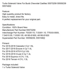 CNC Adjustable Kickstand Side Stand Fit HONDA CBR 600 1000 RR 600RR 1000RR 35.99 USD Free shipping U760E U760 TOYOTA RAV4 Transmission Valve Body For Toyota Camry RAV4 269.87 USD Free shipping Carburetor Carb Rebuild Kit for Yamaha F50-T50hp 4 Stroke 62Y-W0093-11-00 01-04 14.99 USD Free shipping FUEL PUMP FUSE RELAY fit for Yamaha YZF R1 R6 FZ1 Fazer FZ8-N Naked 5VK-81950-40 28.99 USD Free shipping STARTER CLUTCH ASSY FOR YAMAHA FZ1 FZ8 YZF-R1 R1 2004-2015 # 5VY-15570-00-00 21.79 USD Free shipping Gbox Detent Kit for Porsche Transmission 996 997GT3 Boxster S Fixes 2ND Gear WR 18.99 USD Free shipping 6L80 6L90 Transmission Rebuild 1-2-3-4 3-5-Reverse Clutch Seals Pack O-Rings 21.99 USD Free shipping Voltage Rectifier Regulator For Ski-Doo Lynx Forest Legend Touring 515175661 36.69 USD Free shipping Heater Hose Output T Pipes 87248-60460 Fit Toyota Land Cruiser FZJ80 100Series 11.99 USD Free shipping 0B5 DL501 Transmission Valve Body For Audi VW Porsche 629.99 USD Free shipping 7Pcs Pneumatic Fan Clutch Wrench Set Removal Tool Kit For Ford/GM/Chrysler/Jeep 49.87 USD Free shipping Rear Hugger Fender Mudguards ABS Fairing For Honda CBR954RR 2002-2003 Carbon 39.76 USD Free shipping A Fantastic Shop Send us a message Our Store Seller Profile Feedbacks Save this seller Contact Turbo Solenoid Valve For Buick Chevrolet Cadillac 55573259 55559239 55574902 Turbo Solenoid Valve For Buick Chevrolet Cadillac 55573259 55559239 55574902 Feature: High quantity product for factory. Easy to install, direct fits. A perfect replacement for your original part. Specifications: Condition: 100% Brand New Manufacturer Part Number:55573259 Interchange Part Number: 70335110, 7.03351.10, 775333-0005, 7.04010.00, 7.03351.05, 49180-81600, 49180-81620 Superseded Part Number: 55559239, 55574902 Fitment: For 2016-2018 Cascada 4 Cyl 1.6L For 2017-2018 Encore 4 Cyl 1.4L For 2016-2018 ATS 6 Cyl 3.6L For 2016-2018 Cruze 4 Cyl 1.4L For 2018 Equinox 4 CYL 1.5L For 2018 Terrain 4 CYL 1.5L Package included: 1 x Turbo Solenoid Valve About US About Our Items We strive to describe all items accurately and thoroughly, with the utmost care and attention to detail. However, to ensure a mutually satisfactory transaction, we kindly ask for your assistance in thoroughly reviewing the item description and photos, and addressing any questions before placing a bid. Customer Satisfaction We stand behind our commitment with exceptional service, a 100% money-back guarantee, and a dedication to customer satisfaction. I am readily available to address any inquiries or concerns you may have, both before and after your purchase. Our aim is to ensure your shopping experience is enjoyable and that you're delighted with your purchase. Feedback Your feedback is crucial to our business's success. If you're satisfied with your purchase and the service you received, we would greatly appreciate your positive feedback, along with an overall Detailed Selling Rating (DSR) of 5. Please take a moment to leave us positive feedback. Our eBay account is set up to automatically reciprocate positive feedback once yours is received. If you're considering leaving neutral/negative feedback or opening an eBay/PayPal case, we encourage you to reach out to us immediately. We're committed to resolving any issues to the best of our ability. Shipping Parcel will be shipped using Standard shipping method. For security purposes, items will be shipped exclusively to the confirmed address on Paypal. Please ensure your Shipping address is up to date before proceeding with payment. Estimated delivery time within the United States ranges from 3 to 10 business days, depending on your location. Returns We accept returns within 60 days from the date the buyer receives the item. If the item is found to be defective upon receipt, the customer has up to 30 days from the date of receipt to request an exchange for a new item or a refund. For returns due to a change of mind, we accept items in their original selling condition. However, if the package has been opened due to a mistaken order, it does not qualify for our return policy. Please note that the buyer is responsible for covering the cost of return postage. If you encounter any issues, please reach out to us via eBay message, and we'll respond within 24 hours. 3.5" Black High Flow Turbo Intake Elbow For GM 6.6L LML Duramax Diesel 11-16 109.87 USD Free shipping New Turbo Turbocharger for Honda Civic CR-V 1.5L L15B7 2016-2021 49373-07011 US 269.99 USD Free shipping 2PCS Air Duct Seal To Turbocharger 6420940480 6420940580 Fit Mercedes! 13.79 USD Free shipping 2PC TiAL MV-S 38mm Wastegate V-Band Clamp Set Kit with Screws Nuts and Seals YU 32.77 USD Free shipping Charge Pipe C Clip Fit For BMW N54 N55 335i 535i 535xi 335xi 335is 135 UE 11.21 USD Free shipping Electronic Turbocharger Actuator for Jaguar / Land Rover 2.2D 49477-01214 108.99 USD Free shipping Tial Sport 50mm Weld Blow Off Valve BOV Aluminum Flange Turbo 50mm TiAL Flange 13.79 USD Free shipping NEW Turbo Turbocharger Fit Fiat Viaggio Bravo Ottimo 1.4T-Jet 55235154 807072 US 139.99 USD Free shipping New Turbo Electric Actuator For Audi A6 EA888 Gen3 2.0T 06L145612L 70597387 75.79 USD Free shipping Turbo Boost Pressure Control Valve for BMW 1 3 5 6 7 X3 X5 X6 11747796338 F8 26.62 USD Free shipping Turbocharger Wastegate Actuator 04E145725CM 49180-18821 for VW Golf Passat 90.99 USD Free shipping 3 PCS A/C Heater Control Knob Fit For Toyota Tacoma 1995-2004 55905-35310 18.99 USD 19.99 USD Free shipping 5% off